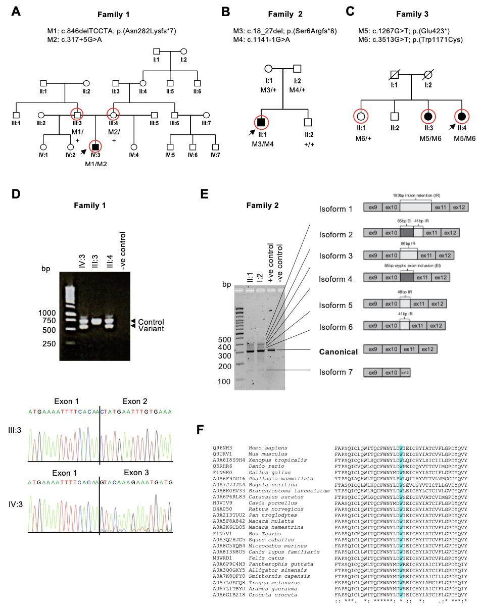 Supplemental Figure 1. Segregation of TBC1D32 variants in the three families. A-C) Pedigrees of the three families carrying TBC1D32 variants. Open squares and circles represent healthy males and females, respectively; black squares and circles represent affected males and females, respectively; diagonal lines represent deceased individuals; Roman numerals denote the generation number, and Arabic numerals denote the individuals within a generation. Arrows indicate the probands and red circles indicate the individuals for whom WES was performed. A) Family 1 is of French origin. Patient 1 (IV:3) is compound heterozygous for the indel variant M1 and the splice variant M2 (M1/M2). The father (III:3) is a carrier of the indel variant (M1/+) and the mother (III:4) is a carrier of the splicing variant (M2/+). B) Family 2 is of Italian origin. Patient 2 (II:1) is compound heterozygous for the indel variant M3 and splicing variant M4 (M3/M4), and the unaffected brother (II:2) carries two wild type alleles (+/+). C) Family 3 is of Spanish origin. The affected sisters, Patients 3 and 4 (II:3 and II:4), are compound heterozygous for the nonsense variant M5 and the missense variant M6 (M5/M6), whereas the unaffected sister (II:1) carries only the missense variant (M6/+). D) RT-PCR analysis of RNA from Patient 1 (IV:3) and his parents (III:3 and III:4) using primers in exons 1 and overlapping the junction of exons 5 and 6 to evaluate the impact of the TBC1D32 splicing variant M2. The upper band represents the control allele, and the lower band represents the M2 allele. Sequencing electropherograms showing the exon 1 and 2 junction following RT-PCR analysis of individual III:3 (who does not carry the M2 variant) and the exon 1 and 3 junction in the proband IV:3 due to exon 2 skipping. The vertical line represents the beginning of the divergent sequences between the proband and his father. E) RT-PCR analysis of RNA isolated from Patient 2 (II:1), his father (I:2), and a control, using primers overlapping the junction of exons 9 and 10 (forward) and exons 12 and 13 (reverse), to analyze the effect of the M4 variant. A single amplicon of 310 bp, corresponding to the canonical splicing form, is observed in the control sample. A similarly-sized amplicon, as well as longer and shorter amplicons, were observed in the patient and his father, corresponding to the 7 aberrant splicing isoforms promoted by M4. F) Alignment of the orthologous sequences of the Rab GAP TBC domain on either side of the Trp residue at position 1171 (highlighted in blue), which is altered by the missense variant in family 3, showing the high degree of amino acid conservation across species. From the left to the right column: accession number, species name, and amino-acid sequence. * indicates a conserved residue, : indicates amino-acids with highly similar properties, and . indicates poorly-conserved amino-acids. |
