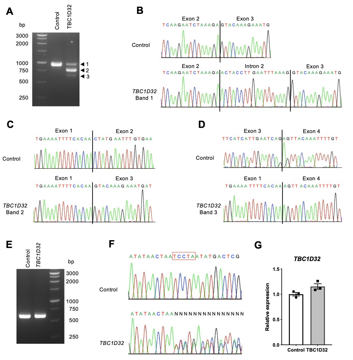 Supplemental Figure 11. Effect of TBC1D32 variants carried by Patient 1 at the mRNA level. A) RT-PCR analysis of RNA isolated from control and Patient 1 fibroblasts using primers specific to exons 1 and 8 to further analyze the effect of the c.317+5G>A variant. A single amplicon of 931 bp is observed in control fibroblasts. Three amplicons of 949 bp (Band 1), 769 bp (Band 2) and 591 bp (Band 3) are observed in TBC1D32 fibroblasts. B) Sequencing electropherograms (A, T, C, G) following subcloning of Band 1 shows the insertion of 18 bp of intron 2 between the exons 2 and 3 in comparison to the control sequence. C) Sequence electropherograms of Band 2 shows the skipping of exon 2 in comparison to the control sequence. D) Sequence electropherograms of Band 3 shows the skipping of exons 2 and 3 in comparison to the control sequence. The vertical lines in B, C and D represent the exon-intron junctions. E) RT-PCR analysis of RNA isolated from control and Patient 1 fibroblasts using primers specific to exons 6 and 11 to assay the effect of the c.846delTCCTA variant. A single amplicon of 604 bp is observed in control and TBC1D32 fibroblasts. F) Sequence electropherograms show the deletion of the TCCTA sequence (boxed in red) and subsequent frameshift in TBC1D32 fibroblasts as compared to controls. G) qPCR analysis of TBC1D32 expression levels in control (black bars) and TBC1D32 (grey bars) fibroblasts. Data are represented as mean ± SEM. |