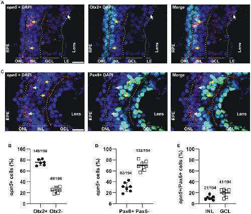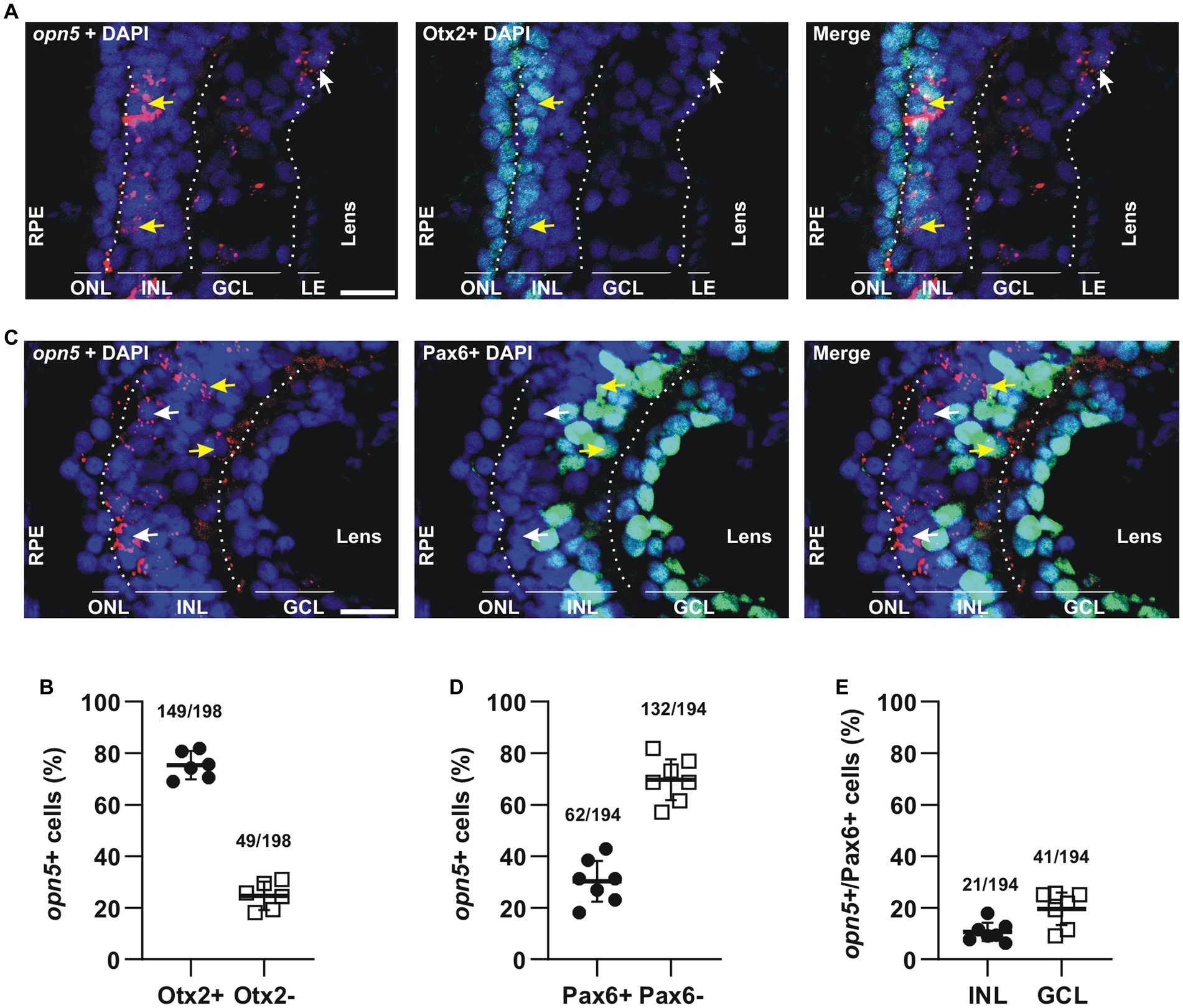 Figure 3. opn5 is expressed in bipolar and amacrine cells in the INL and in RGCs. (A,C) FISH against opn5 (red) followed by immunohistochemistry against a bipolar cell marker (Otx2; green) (A) or an amacrine and retinal ganglion cell marker (Pax6; green) (C), on stage 41 Xenopus laevis transverse retinal sections. DAPI (blue) stains the nucleus. ONL (outer nuclear layer), INL (inner nuclear layer), and GCL (ganglion cell layer) are indicated between dotted lines. White arrows point to opn5-expressing cells that are either Otx2− or Pax6−, while yellow arrows indicate opn5+ cells that are also Otx2+ or Pax6+. RPE, retinal pigment epithelium. Scale bar = 50 μm. (B,D,E) Graphs showing percentage of opn5+ cells that are Otx2+ (B) or Pax6+ (D), and the distribution of Pax6+/opn5+cells between the INL and GCL of stage 41 retina (E). Each dot represents the percentage of cells in one central retina section [(B), n = 6 sections; (D,E), n = 7 sections]. Lines are the mean with 95% confidence interval.