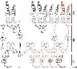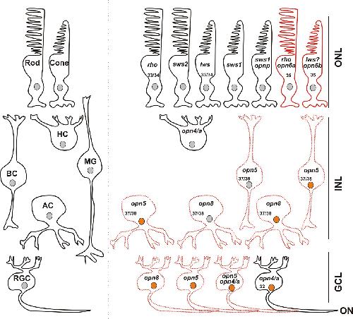 Figure 8. Opsin-expressing cells in the retina of a stage 43/44 Xenopus tadpole. Photoreceptors located in the outer nuclear layer (ONL) express the classical opsins in rods (rho or sws2; Kojima et al., 2017) and cones (lws and sws1). Pinopsin (opnp) is co-expressed in a few sws1+ cells (Bertolesi et al., 2021). Labeled with red are cells expressing opn6a and opn6b in rods (rho+) and cones, likely lws+, respectively. In the inner nuclear layer (INL), horizontal cells (HC) co-express the two melanopsin genes (opn4 and opn4a), bipolar cells (BC) express opn5, while amacrine cells (AC) express opn5 or opn8. Different cells in the ganglion cell layer (GCL) express opsins, including opn5, opn8, opn4/opn4a, and a few cells that contain opn4/a and opn5. Cells that express c-fos in response to exposure to white light are shown with an orange nucleus. Although classical photoreceptors are c-fos negative, they are highly likely activated by the white light exposure. We propose that opsin-expressing cells in the INL or GCL that exhibit light-induced c-fos expression serve as second- or third-order neurons, which receive synaptic inputs from photoreceptors or other retinal cells. We cannot rule out, however, that the opsin-expressing cells of the INL and GCL are intrinsically photosensitive and induce c-fos mRNA upon light stimulation, acting as first-order neurons. opn4/a+ HCs do not express c-fos while opn4/a+ RGCs do (Bertolesi et al., 2014). Opsin-expressing cells that we describe in this manuscript are either labeled with red solid lines (PR; photoreceptors), or red dotted lines as having the potential to be photosensitive in Xenopus, since direct light activation has not yet been demonstrated. Excluded are all the photoreceptors, and HCs and RGCs expressing melanopsins, for which photosensitivity was demonstrated in fish (Cheng et al., 2009) and mammals (Thoreson and Dacey, 2019). Numbers in the cells indicate the development stage of Xenopus when opsin expression is first detected (See also Table 1).