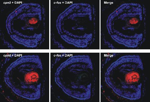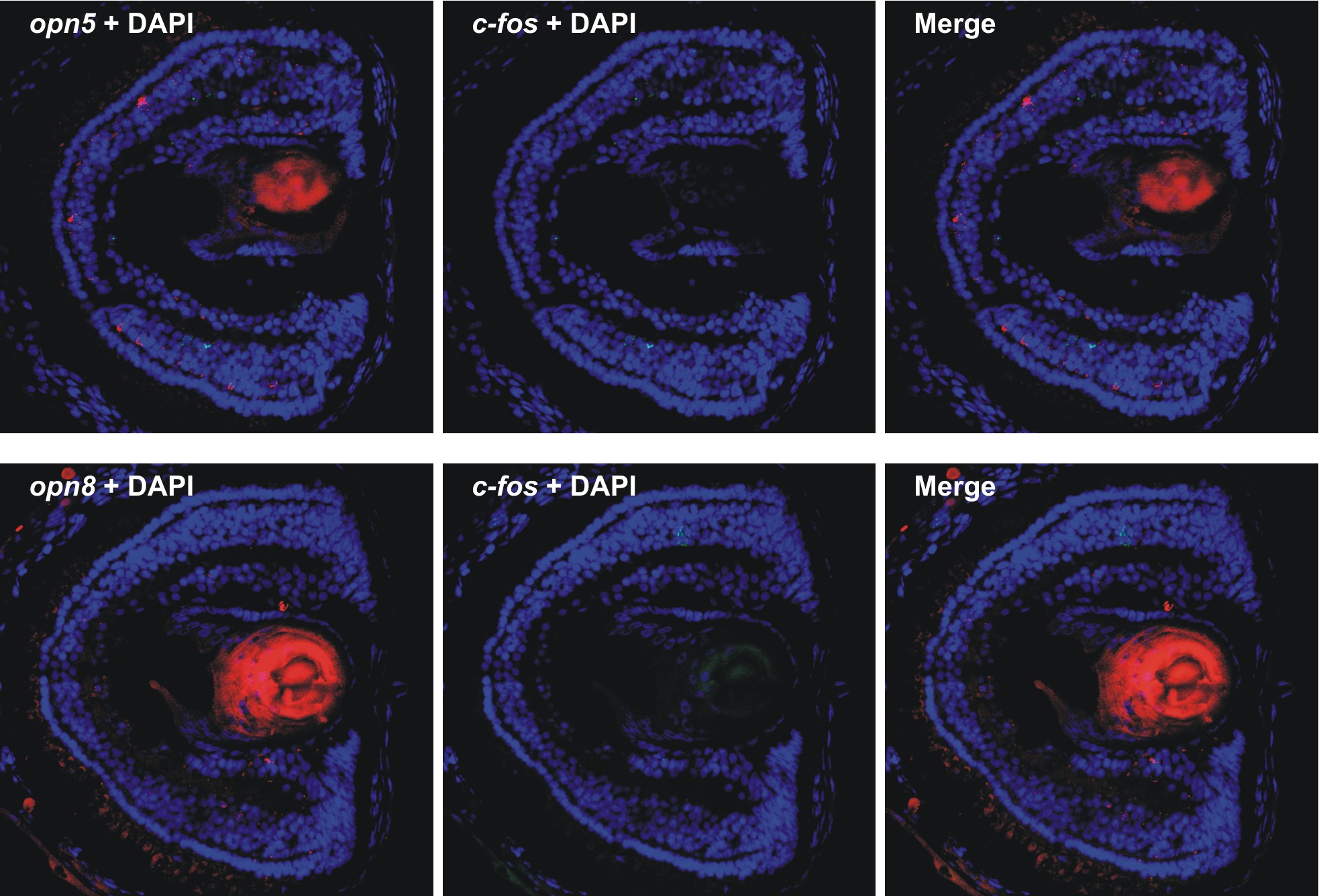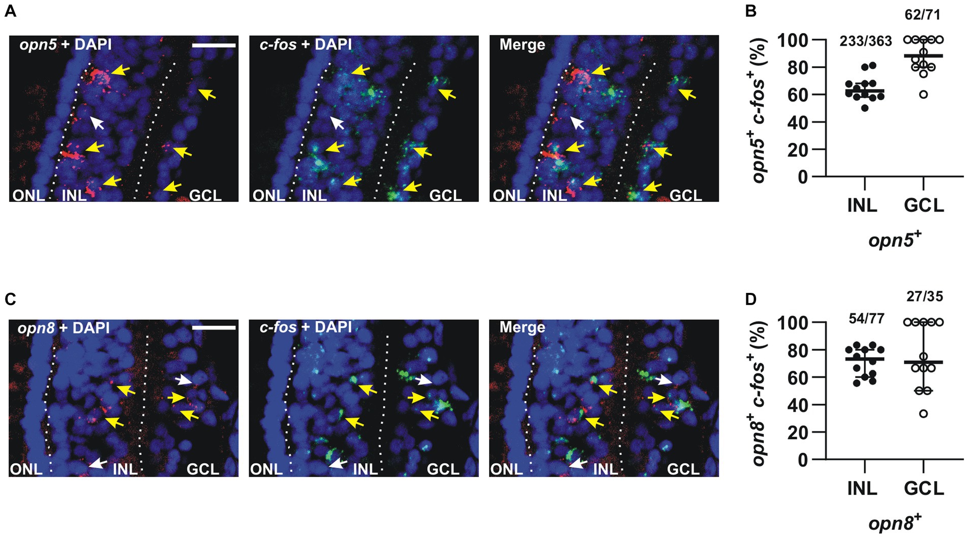 Figure 6. The majority of opn5+ and opn8+ cells were activated in response to light. (A,C) Double FISH against opn5 (red) and c-fos (green) (A) and opn8 (red) and c-fos (green) (C) on stage 43/44 Xenopus laevis transverse retinal sections after 30 min of light stimulation. DAPI (blue) stains the nucleus. White arrows point to opn5+ or opn8+ cells that do not express c-fos, while yellow arrows point to opn5+ or opn8+ cells that are also c-fos+. GCL, ganglion cell layer; INL, inner nuclear layer; ONL, outer nuclear layer. Scale bar = 50 μm. (B,D) Quantification and distribution between the INL and GCL of cells co-expressing opn5 and c-fos (B) and opn8 and c-fos (D). Each dot represents the percentage of cells in one central retina section n = 12 sections; Lines are the mean with 95% confidence interval.