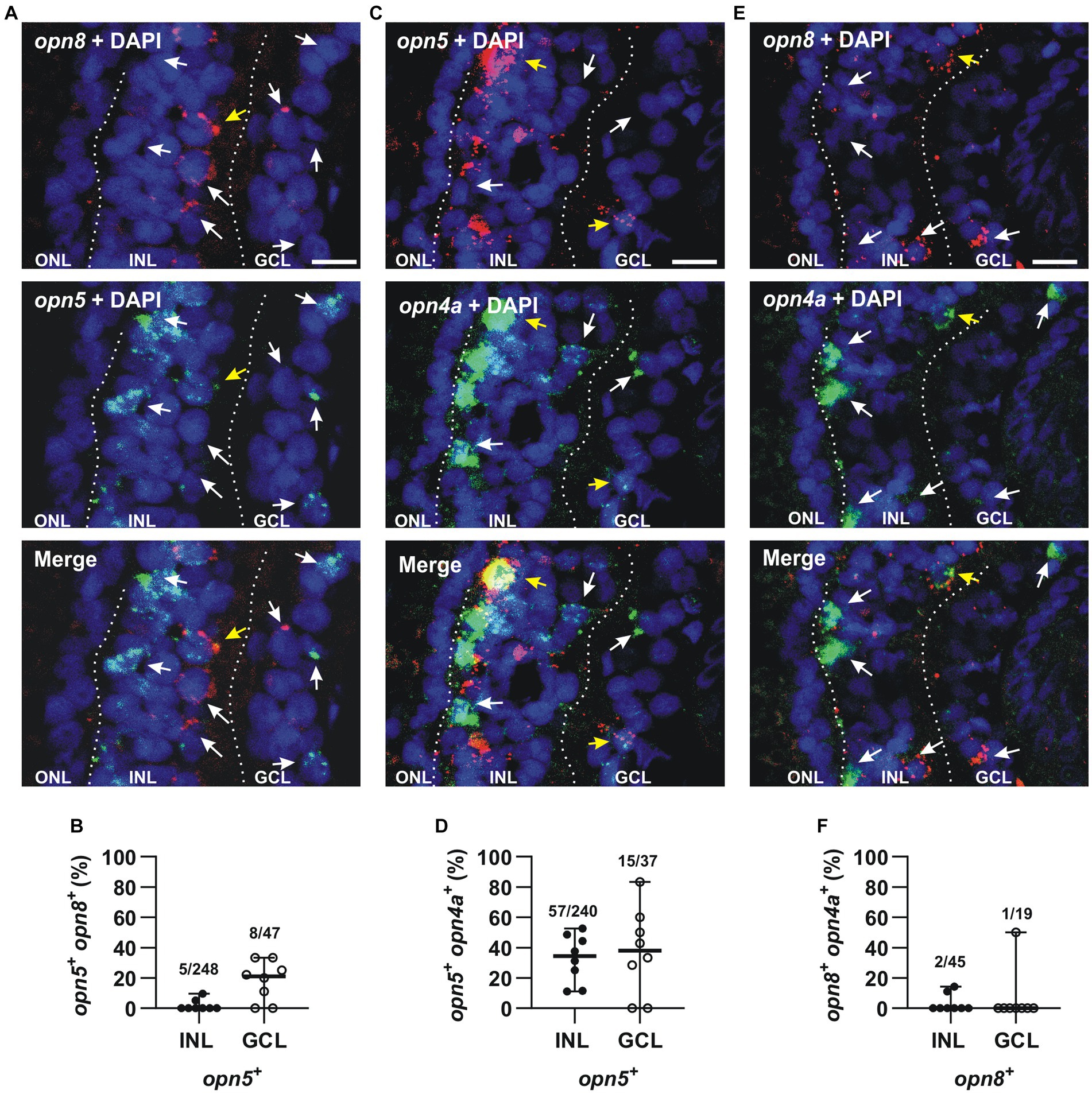 Figure 5. opn5 and opn8 sparsely co-express in the GCL but not INL, while opn4 and opn5 are partially co-expressed in both GCL and INL, and opn4 and opn8 do not co-express. (A,C,E) Double FISH against opn5 (green) and opn8 (red) (A), opn5 (red) and opn4a (green) (C), and opn8 (red) and opn4a (green) (E) on stage 43/44 X. laevis transverse retinal sections. DAPI (blue) stained the nucleus and is shown with the merged image. White arrows point to cells that express a single opsin, while yellow arrows point to cells that express two opsins. GCL, ganglion cell layer; INL, inner nuclear layer; ONL, outer nuclear layer. Scale bar = 20 μm. (B,D,F) Graphs showing distribution between the INL and GCL of cells that co-express opn5 and opn8 (B), opn5 and opn4a (D) and opn8 and opn4a (F). Each dot represents the percentage of cells in one central retina section [n = 8 sections, (B,D,F)]. Lines are the mean with 95% confidence interval.