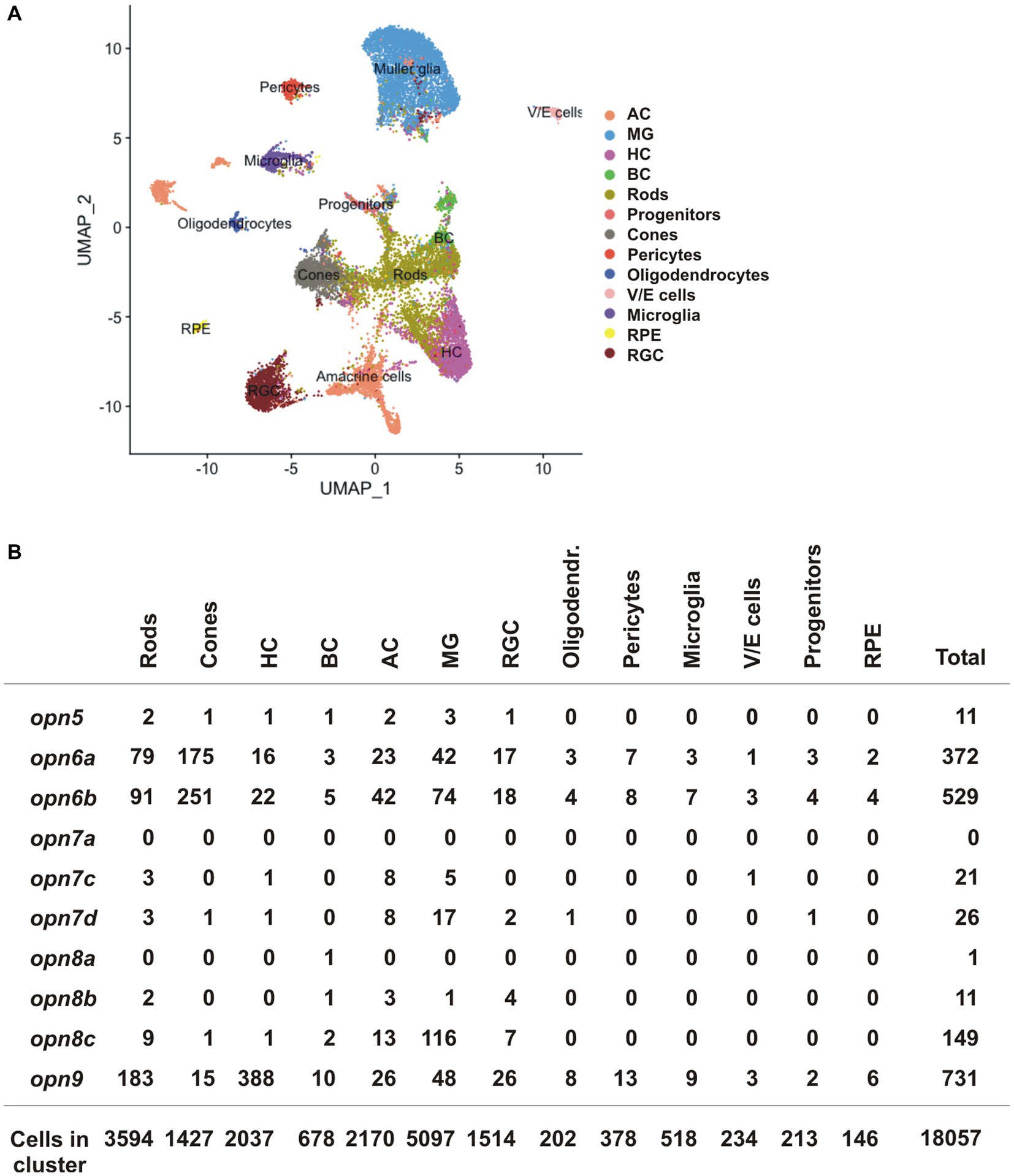 Figure 7. scRNA-seq data from the adult zebrafish (Hoang et al., 2020). (A) UMAP plot featuring annotated retinal cell types (Supplementary Table S1). (B) Quantification of cells which express neuropsin mRNA organized by cell type detected by scRNA-seq