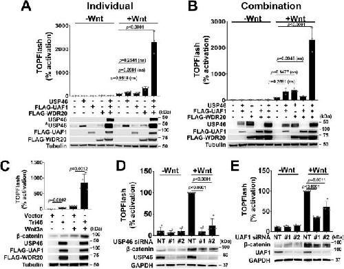 Fig. 1: The USP46 complex is a positive regulator of Wnt signaling. A–C Overexpression of the USP46 complex stimulates Wnt activation and stabilizes β-catenin levels. HEK293 STF cells were transfected and treated with recombinant Wnt3a (10 ng/ml) for 24 h as indicated. A Individual and B pairwise overexpression of USP46, FLAG-tagged WDR20, and FLAG-tagged UAF1 in HEK293 STF cells in the presence of Wnt3a leads to lower Wnt reporter (TOPFlash) activity compared to overexpression of all three members. The asterisk in (A) indicates a longer exposure for the USP46 blot. C Overexpression of the USP46 complex (Tri46) in HEK293 STF cells potentiates Wnt3a-mediated TOPFlash and promotes β-catenin stabilization. For transfections, the amount of total DNA was kept constant by the addition of vector plasmid. p values compare vector-transfected with USP46 complex-transfected cells. Tubulin is loading control. D, E Knockdown of USP46 and UAF1 by siRNA inhibits Wnt signaling and decreases β-catenin levels. HEK293 STF cells were transfected with non-targeting control (NT) or two independent (D) USP46 or (E) UAF1 siRNAs and treated with recombinant Wnt3a. Immunoblotting confirmed the knockdown of USP46 and UAF1 proteins. GAPDH is loading control. All graphs show mean ± SD of TOPFlash normalized to vector control in the presence of Wnt. p values compare NT treated to USP46 or UAF1 siRNA-treated cells. p ≥ 0.05 is not significant (ns). Significance was analyzed by one-way ANOVA followed by Tukey’s multiple comparisons test. Graphs all show a representative of n = 3 biologically independent experiments. All immunoblots are representative of at least three independent experiments. Source data are provided as a Source data file. |