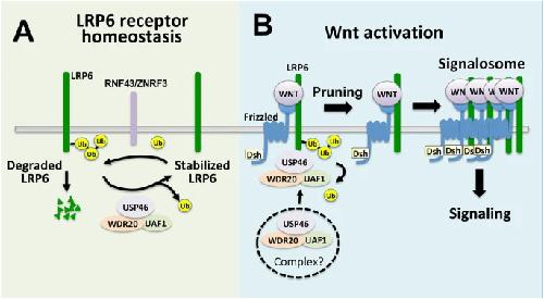 Fig. 6: Model of USP46 complex regulation of LRP6 in the Wnt pathway. A The USP46 complex catalyzes the deubiquitylation of LPR6, opposing the activities of RNF34 and ZNFR3 (and potentially other E3 ligases) to maintain low homeostatic levels of LRP6. B Upon Wnt ligand binding to Frizzled and LPR6, the USP46 complex is recruited to and deubiquitylates LPR6, allowing LRP6 to be assembled into the Wnt signalosome. |