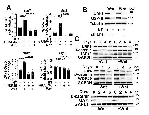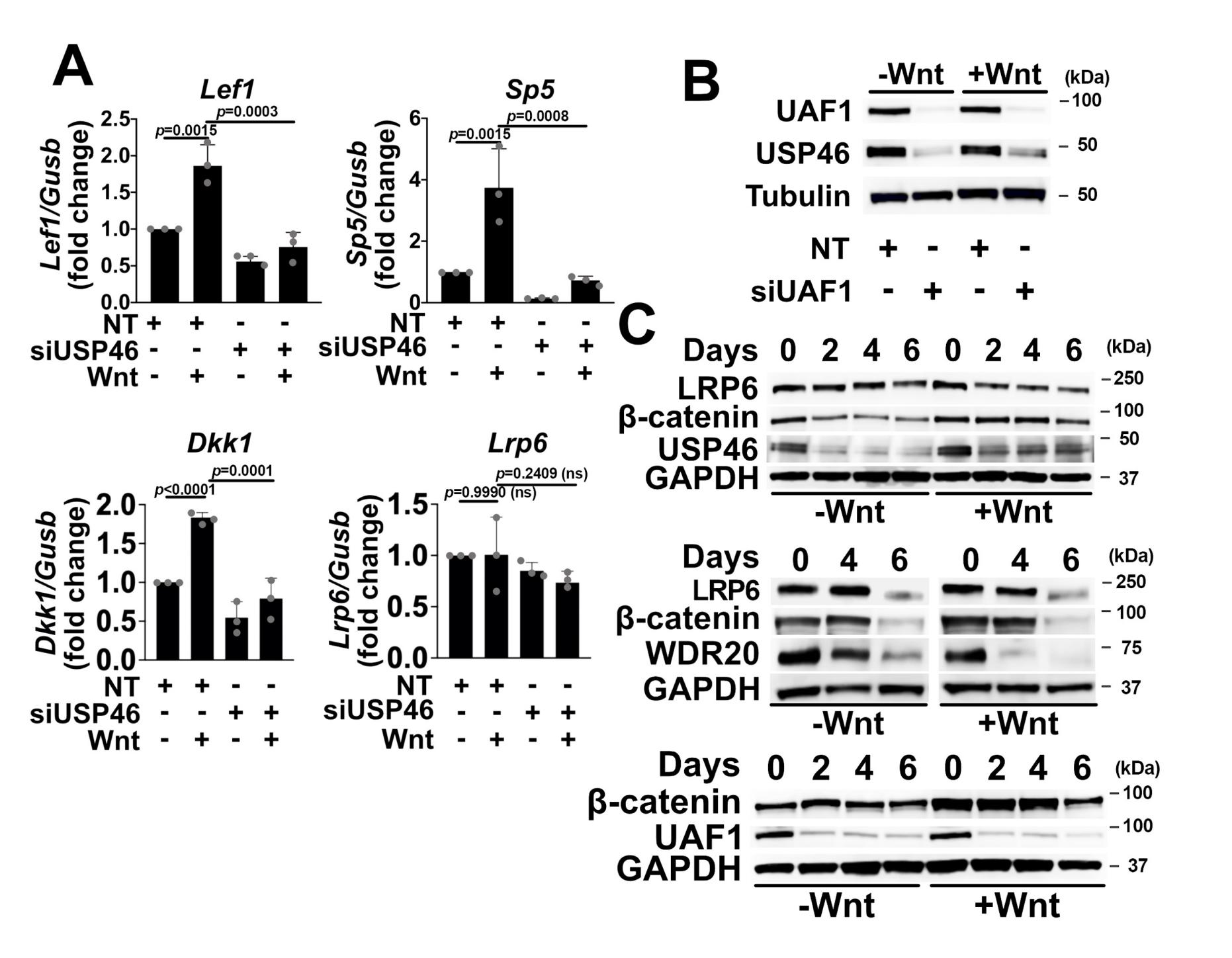 Supplementary Figure 1. USP46 promotes Wnt signaling upstream of the b-catenin degradation complex. (A) Quantitative real-time RT-PCR of endogenous Wnt target genes and Lrp6 in HEK293 treated with USP46 siRNAs or non-targeting (NT) control. Graphs show a ratio relative to Gusb (control). Results (mean ±SD) of three independent real-time RT-PCR reactions are shown. p-values compared Wnt3a-treated NT to non-Wnt treated NT and Wnt3a-treated USP46 siRNA. p≥0.05 is not significant (ns). Significance was analyzed by one-way ANOVA followed up with Tukey’s multiple comparisons test. (B) Knockdown of UAF1 decreased levels of USP46. HEK293 cells were transfected with non-targeting (NT) or pooled UAF1 siRNAs, and immunoblotting for USP46 and UAF1 was performed. (C) Knockout of USP46, WDR20, and UAF1 by CRISPR-Cas9 editing decreased b-catenin and LRP6 levels. HEK293T cells stably expressing Cas9 were transfected with tracrRNA and crRNAs targeting individual components of the USP46 complex. Cells were treated with or without Wnt3a (10ng/ml), and lysates were collected for immunoblotting on the indicated days. Graphs and immunoblots are representative of at least three independent experiments. Source data are provided as a Source Data file. |