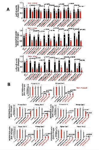 Supplementary Figure 3. CRISPRi of USP46 complex in zebrafish result in a reduction of Wnt target gene transcripts. (A) mRNAs were isolated from injected single embryos, and Lef1, CyclinD1, and c-Myc levels were quantified by RTPCR. (B) qRT-PCR confirms significant reductions in mRNA levels of USP46 components in their respective guide RNA plus dCas9-injected embryos. Two primer sets were used for each gene. Gene expression is graphed as a ratio to b-actin control. p-values compare guide RNA-injected versus guide RNA plus dCas9-injected embryos. Graphs show mean ± SEM. Significance was analyzed by two-tailed Student’s t-test. Comparisons between Wildtype (WT) control versus dCas9, WT versus guide RNA alone, and dCas9 versus guide RNA alone were not statistically significant. Source data are provided as a Source Data file. |