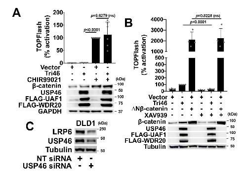 Supplementary Figure 4. The USP46 Complex act upstream of the b-catenin destruction complex. (A) Activation of Wnt signaling by GSK3 inhibition is not potentiated by the USP46 complex. HEK293 STF cells were transfected with the USP46 complex and treated with CHIR99021 (2 mM). Graphs show mean ±SD of TOPFlash normalized to CHIR99021 control. p-value compares CHIR99021-treated cells with USP46 complex-transfected cells. ns compares CHIR99021-treated cells transfected with vector control or the USP46 complex. (B) The AXIN stabilizer, XAV939, inhibits Wnt signaling stimulated by the USP46 complex but not by a non-degradable form of b-catenin (DNb-catenin). Cells were transfected as indicated and treated with or without XAV939 (1 mM) overnight. Graphs show mean ±SD of TOPFlash normalized to USP46 complex-transfected control. p-value compares USP46 complextransfected cells minus or plus treatment with XAV939. ns compare DN-b-catenin-transfected cells minus or plus treatment with XAV939. Significance was analyzed by one-way ANOVA followed by Tukey’s multiple comparisons test. Graphs show representatives of n = 3 independent experiments performed in triplicates. p≥0.05 is not significant (ns). (C) Knockdown of USP46 in the colorectal cancer cell line, DLD1, results in decreased LRP6 levels. DLD1 cells were transfected with non-targeting (NT) or pooled USP46 siRNAs. Immunoblots are representative of at least three independent experiments. Source data are provided as a Source Data file. |