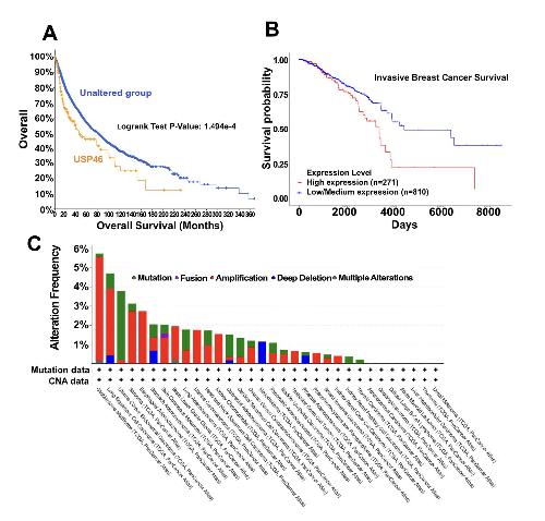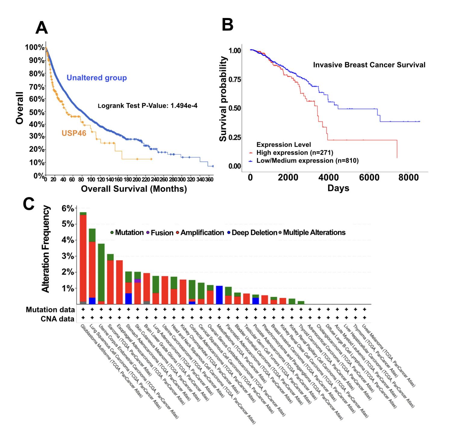 Supplementary Figure 9. USP46 expression is upregulated in cancer and associated with a poorer prognosis. (A) Altered USP46 expression in cancer is associated with decreased overall survival. The median overall survival of patients with USP46 alterations was 45.14 months (N=178) compared to 79.46 months (N=10,623) for the unaltered group across tumor types. (B) High USP46 mRNA expression levels in the TCGA correlate with decreased overall survival in invasive breast cancer (p-value < 0.02). Decreased survival was also observed for liver hepatocellular carcinoma (p-value < 0.02) and sarcoma (p-value < 0.05). (C) Gene amplification of USP46 is commonly observed in human cancers. Altered group: fusions, deletions, amplifications, and mutations. CNA, copy number alteration. |