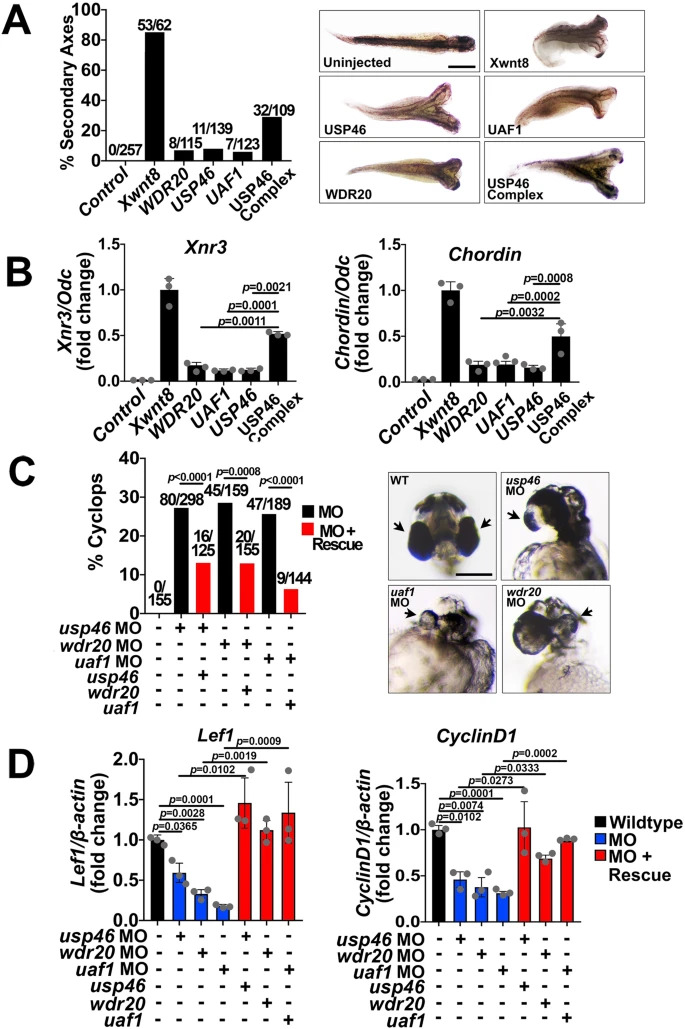 Fig. 2: The USP46 complex regulates Wnt signaling in Xenopus and zebrafish. A, B The USP46 complex induces secondary axis formation and Wnt target gene expression in Xenopus embryos. A Xenopus embryos were injected ventrally at the 4-cell stage with Xwnt8 mRNA (10 pg), individual USP46 members (1 ng), or a 1:1:1 mixture (0.33 ng each). The percentage of axis duplication is shown with absolute numbers on the top of each bar and representative images. p-values for injection of individual components versus the complex and for injected embryos compared to wildtype is <0.0001. Scale bar = 200 mm. B RT-PCR show induction of Xenopus Wnt target genes, Xnr3 and Chordin. Expression is shown as a ratio of Ornithine decarboxylase (Odc) normalized to Xwnt8 injected animal caps. Control is un-injected. p-values compare injections of individual components versus the USP46 complex. C, D Knockdown of the USP46 complex in zebrafish induces a cyclopic phenotype and reduction of Wnt target gene transcripts, which are rescued by co-injecting homologous human mRNAs. C Embryos were injected at the single-cell stage with Morpholino oligonucleotides (MO, 3 ng) and rescued with mRNAs (0.8 ng). The percentage of cyclopic embryos is shown with absolute numbers on the top of each bar. Arrows show developing eyes. p-values compare MO-injected versus rescue. p-values for all injected embryos compared to wildtype is <0.0001. Scale bar = 200 mm. D mRNAs were isolated, and Lef1 and CyclinD1 levels were quantified by RT-PCR. Gene expression is graphed as a ratio to β-actin control and normalized to un-injected embryos. p-values shown compare MO-injected versus un-injected embryos and morpholino-injected versus corresponding rescued embryos. B, D Graphs show mean ± SEM, n = 3 independent pools of embryos. Significance was analyzed by two-tailed Student’s t test. Source data are provided as a Source data file. |