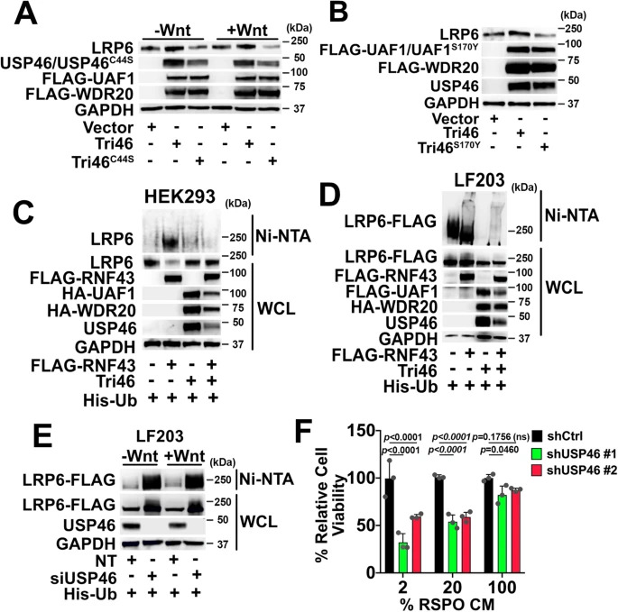 Fig. 5: The USP46 complex deubiquitinates LRP6 and opposes the action of the Wnt receptor E3 ligase, RNF43. A, B The catalytic activity of USP46 is required for its regulation of LRP6 levels. Cells expressing the wild-type or mutant USP46 complexes were incubated in the absence or presence of Wnt3a, and immunoblotting was performed. A Overexpression of the USP46 complex containing the catalytically dead USP46C44S (Tri46C44S) does not increase LRP6 levels. B Overexpression of the USP46 complex containing the USP46 binding mutant, FLAG-UAF1S170Y, does not increase LRP6 levels. GAPDH is loading control. C–E His-ubiquitylation assays. HEK293 cells were transfected as indicated, lysed under denaturing conditions, and His-Ub (hexahistidine-tagged ubiquitin) modified proteins isolated by nickel affinity purification. LRP6 and FLAG-tagged proteins were detected by immunoblotting with anti-LRP6 and anti-Flag antibodies, respectively. C Overexpression of FLAG-RNF43 promotes endogenous ubiquitylation of LRP6, which is opposed by overexpression of the USP46 complex. D Overexpression of FLAG-RNF43 in LF203 cells similarly promotes LRP6-FLAG ubiquitylation, which is opposed by overexpression of the USP46 complex. E Knockdown of USP46 enhances LRP6-FLAG ubiquitination. WCL = whole cell lysates. F The sensitivity of intestinal organoids to USP46 depletion is RSPO-dependent. Exogenous RSPO is essential for culturing intestinal organoids in vitro. Intestinal organoids infected with a control lentivirus or two independent lentiviruses expressing USP46 shRNAs were grown with decreasing RSPO conditioned media (CM). Viability was assessed by Cell-Titer Glo. p ≥ 0.05 is not significant (ns). Significance was analyzed by one-way ANOVA followed by Tukey’s multiple comparisons test. Graphs show mean ± SD (n = 3 independent experiments). GAPDH is loading control. All immunoblots are representative of at least three independent experiments. Source data are provided as a Source data file. |