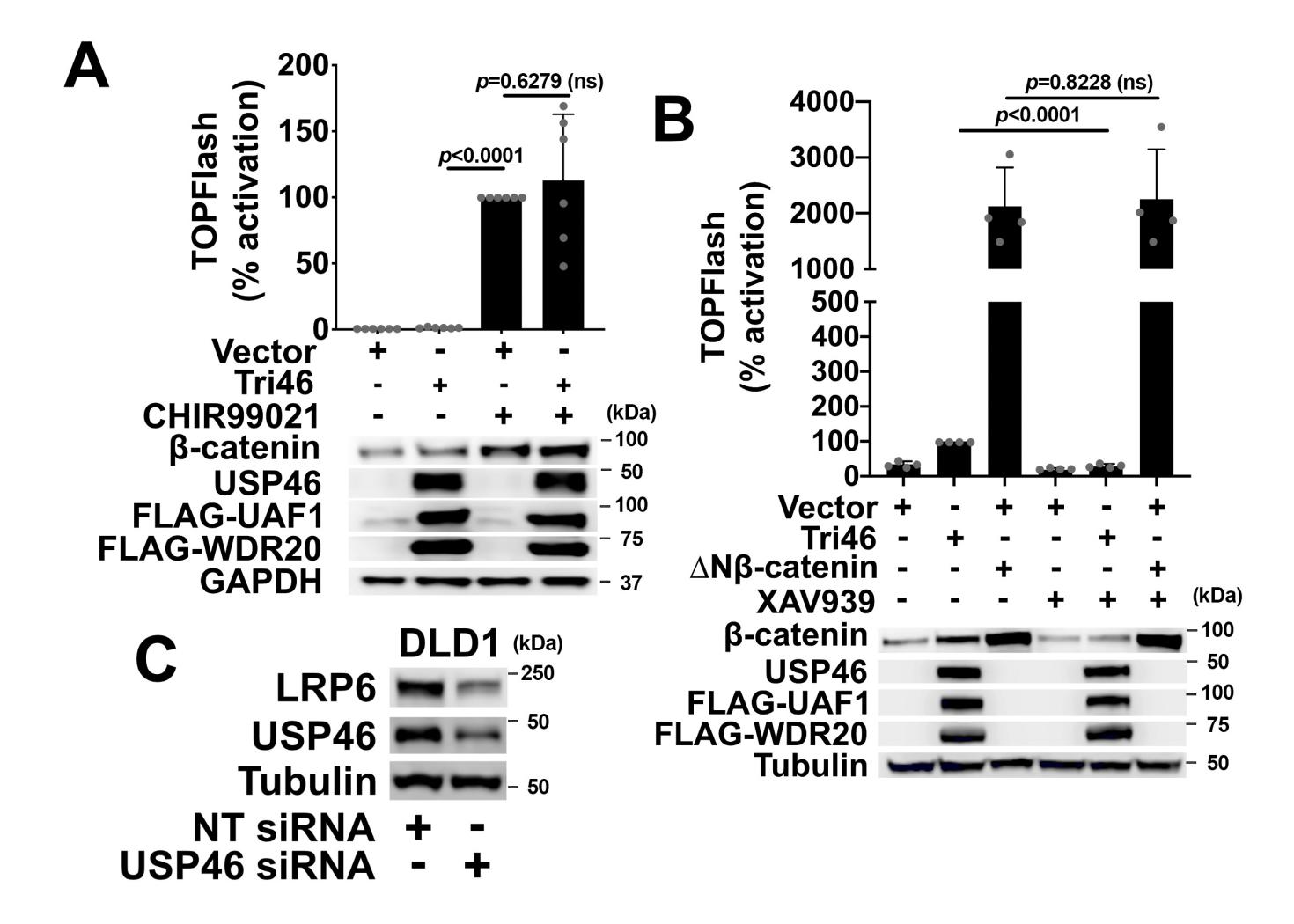 The USP46 complex deubiquitylates LRP6 to promote Wnt/β-catenin signaling.