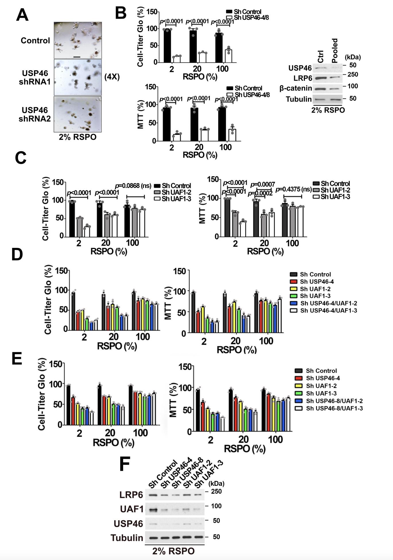 Supplementary Figure 7. The viability of wild-type intestinal organoids is dependent on USP46 and UAF1. (A-F) Knockdown of USP46 and/or UAF1 decreases wild-type intestinal organoid viability. Organoids were infected with control lentivirus or independent lentiviruses targeting USP46 and/or UAF1. (A) Representative images of intestinal organoids treated with USP46 shRNA 1 or 2 and grown in the presence of 2% RSPO-CM. Scale bar = 200 mM. (B) Intestinal organoids infected with a control lentivirus or pooled lentiviruses expressing USP46 shRNAs were grown with an increasing RSPO-conditioned media (CM). Viability was assessed by both Cell-Titer Glo and MTT assays. Graph shows mean ±SD of Cell-Titer Glo and MTT assay, respectively. p-values compare control-treated with pooled USP46 shRNAs. (Right) Immunoblot shows decreased USP46, LRP6, and b-catenin in wildtype organoids with pooled USP46 shRNA treatment. (C) The sensitivity of intestinal organoids to UAF1 depletion is RSPO-dependent. Intestinal organoids infected with a control lentivirus or two independent lentiviruses expressing UAF1 shRNAs were grown with a decreasing RSPO-conditioned media (CM). Viability was assessed by Cell-Titer Glo (top) and MTT assay (bottom). Graph shows mean ±SD of Cell-Titer Glo and MTT assay, respectively. p-values compare control treatment with UAF1 shRNA 1 or 2 treatment. (D-F) Intestinal organoids infected with a control lentivirus or independent lentiviruses targeting USP46 and/or UAF1 were grown with a decreasing RSPO CM. (D-E) Depletion of USP46 and UAF1 results in a greater decrease in cell viability upon reduction of RSPO CM. Viability was assessed by Cell-Titer Glo (left) and MTT assay (right). Graph shows mean ±SD of Cell-Titer Glo and MTT assay, respectively. (D) p-values compare to Sh Controls using Cell-Titer Glo are as follows: <0.0001 for all conditions at 2% RSPO-CM; 0.0002 (Sh USP46-4), 0.0018 (Sh UAF1-2), <0.0001 (Sh UAF1-3), <0.0001 (sh USP46-4/UAF1-2), and <0.0001 (sh USP46-4/UAF1-3) at 20% RSPO-CM; 0.0139 (Sh USP46-4), 0.0756 (ns) (Sh UAF1-2), 0.0120 (Sh UAF1-3), 0.0001 (sh USP46-4/UAF1-2), and 0.0002 (sh USP46-4/UAF1-3) at 100% RSPO-CM. p-values compare to Sh Controls using MMT are as follows: <0.0001 for all conditions at 2% RSPO-CM; <0.0001 (Sh USP46-4), 0.0029 (Sh UAF1-2), <0.0001 (Sh UAF1-3), <0.0001 (sh USP46-4/UAF1-2), and <0.0001 (sh USP46-4/UAF1-3) at 20% RSPO-CM; 0.0128 (Sh USP46-4), 0.0183 (Sh UAF1-2), 0.0009 (Sh UAF1-3), <0.0001 (sh USP46-4/UAF1-2), and 0.0801 (ns) (sh USP46-4/UAF1-3) at 100% RSPO-CM. (E) p-values compare to Sh Controls using Cell-Titer Glo are as follows: <0.0001 for all conditions at 2% RSPO-CM; <0.0001 for all conditions at 20% RSPO-CM; 0.0056 (Sh USP46-8), 0.0002 (Sh UAF1-2), <0.0001 (Sh UAF1-3), <0.0001 (sh USP46-8/UAF1-2), and 0.0002 (sh USP46-8/UAF1-3) at 100% RSPO-CM. p-values compare to Sh Controls using MMT are as follows: <0.0001 for all conditions at 2% RSPO-CM; 0.0020 (Sh USP46-8), <0.0001 (Sh UAF1-2), <0.0001 (Sh UAF1-3), <0.0001 (sh USP46-8/UAF1-2), and <0.0001 (sh USP46-8/UAF1-3) at 20% RSPOCM; 0.2338 (ns) (Sh USP46-8), 0.0013 (Sh UAF1-2), <0.0001 (Sh UAF1-3), <0.0001 (sh USP46-8/UAF1-2), and 0.0013 (sh USP46-8/UAF1-3) at 100% RSPO-CM. p-value > 0.05 is not significant (ns). Significance for all graphs were analyzed by one-way ANOVA followed by Tukey’s multiple comparisons test. All graphs are representative of n = 3 independent experiments performed in triplicates. (F) Immunoblot confirms depletion of USP46 and UAF1 in organoids treated with shRNA lentiviruses. Furthermore, knockdown of USP46 and UAF1 destabilizes UAF1 and USP46, respectively. Immunoblots are representative of three independent experiments. Source data are provided as a Source Data file. |