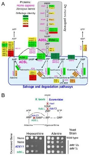Figure 1. The X. laevis adsl.L gene encodes the adenylosuccinate lyase activity required in two non-sequential steps of the highly conserved purine synthesis pathways. (A) Schematic representation of the human and X. laevis purine biosynthesis pathways. Abbreviations: AMP, adenosine monophosphate; GMP, guanosine monophosphate; IMP, Inosine monophosphate; PRPP, Phosphorybosyl pyrophosphate; SAMP, Succinyl-AMP; SZMP, Succinyl-Amino Imidazole Carboxamide Ribonucleotide monophosphate; XMP, Xanthosine monophosphate; ZMP, Amino Imidazole CarboxAmide Ribonucleotide monophosphate. (B) Functional complementation of the growth defect of the yeast adenylosuccinate lyase deletion mutant via expression of the X. laevis adsl.L ortholog gene. Yeast wild-type and adsl knockout mutant (ade13 ade1) strains were either transformed with a plasmid, allowing for expression of the Saccharomyces cerevisiae (ADE13) or the X. laevis (adsl.L) adenylosuccinate lyase encoding genes, or with the empty vector (None). Serial dilutions (1/10) of transformants were dropped on SDcasaWA medium supplemented with either hypoxanthine or adenine as the sole external purine source. Plates were incubated for 48 h at 37 °C before imaging. Of note, the ade1 ade13 double deletion mutant was used in this experiment to avoid genetic instability associated with the accumulation of SZMP and/or its nucleoside derivatives observed in the single ade13 mutant [8]. |
