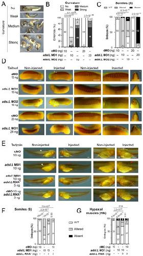 Figure 3. The adsl.L gene is required for somites and hypaxial muscle formation in X. laevis. (A) Representative images of adsl.L morphants following adsl.L MO1 injection at either 10 ng (weak and medium curvature) or 20 ng (medium and strong curvature). (B) Quantification and statistics of the curvature phenotype. (C–G) Immunostaining with the differentiated muscle-cell-specific 12-101 antibody revealed a strong alteration of somites and hypaxial muscle formation in adsl.L knockdown and adsl.L overexpressing embryos. Representative images (D,E) and quantification and statistics (C,F,G) of somites and hypaxial muscles phenotype at tailbud (C,D) and tadpole (E–G) stages. Injected side is indicated by asterisks. S, somites; HM, hypaxial muscles. Bars: 0.5 mm. White and red arrowheads point to typical somite chevron shapes and altered somites, respectively. The adsl.L RNA* refers to mutated RNA whose translation was not affected by the adsl.L specific MOs (Figure S3). Numbers above the bars of histograms correspond to p-values. |