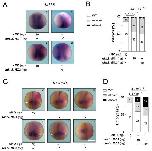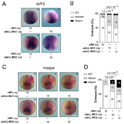 Figure 4. The adsl.L gene is required for the expression of tcf15 and mespa genes involved in early somitogenesis. Expression of tcf15 (A,B) and mespa (C,D) genes at late neurula stage is altered by the knockdown of adsl.L gene. Representative images of trf15 (A) and mespa (C) RNA expression revealed via in situ hybridization. Statistics are shown in (B) and (D) for trf15 and mespa RNA, respectively. White arrows point to the anterior domain of the somitomere S-II on both sides of the embryos. Injected side is indicated by asterisks. Numbers above the bars of histograms correspond to p-values. Bars: 0.5 mm. |