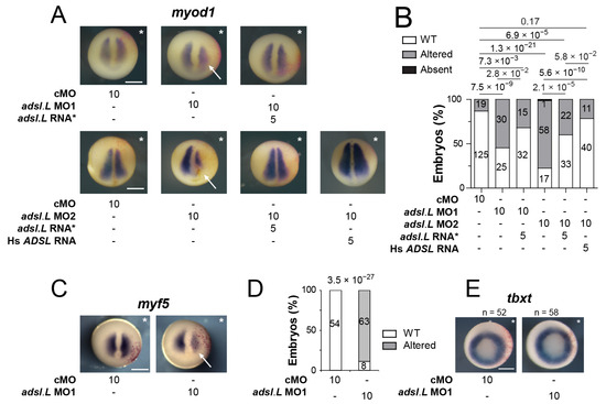 Figure 5. Expression of the myogenic regulatory factors myod1 and myf5 in paraxial mesoderm was strongly affected by the knockdown of the adsl.L gene. (A) Expression of myod1 gene at the early neurula stage was altered by the knockdown of adsl.L gene and rescued by adsl.L RNA* and human ADSL RNA. (C) Representative images of the effect on myf5 RNA expression by adsl.L knockdown at stage 12.5 revealed via in situ hybridization. (B,D) Quantification and statistics of the myod1 and myf5 expression phenotypes are presented in (A,C), respectively. (E) Knockdown of adsl.L did not alter the mesoderm formation, as revealed by the absence of change in tbxt (xbra) RNA expression domain at stage 11. Injected side is indicated by asterisks. The amounts of MO and RNA presented in this figure are in ng. Bars: 0.5 mm. Numbers above the bars of histograms correspond to p-values. White arrows point to the domain where expression of either myod1 or myf5 is altered. |