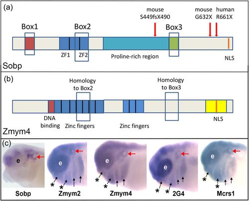 Figure 2 Candidate Six1 co-factors. (a) Schematic of the domains present in human and Xenopus Sobp proteins. Sobp contains a C-terminal nuclear localization signal (NLS), two FCS-type Zinc finger domains (ZF1 and ZF2), and a proline-rich region of 245 amino acids. Box 1 includes 20 amino acids that are identical in Xenopus and human proteins. Box 2 includes one of the FCS-type ZF domains. Box 3 is a 25 amino acid domain identical in Xenopus and human proteins. The amino acid locations of the known mouse and human SOBP mutations are indicated by red arrows. Each mutation introduces a stop codon (X) that truncates the protein (Birk et al., 2010; Chen et al., 2008). Box 2 and Box 3 were used in a BLAST search that identified Zmym2 and Zmym4 (Neilson et al., 2010). (b) Schematic of the domains present in human and Xenopus Zmym4 proteins. Like Sobp, it contains several FCS-type ZF domains and a C-terminal NLS. A presumed DNA-binding domain is located N-terminal to the ZFs. The yellow box indicates a DUF3504 domain. Regions of homology to Sobp Box 2 and Box 3 are indicated. (c) Wholemount in situ hybridization images of wild-type embryos indicating the expression domains of transcripts encoding Sobp, Zmym2, Zmym4, 2G4 and Mcrs1 (from Neilson et al., 2010). Red arrows indicate the otic vesicle, which gives rise to the inner ear. Arrows indicate the branchial arches, which give rise to elements of the middle ear (asterisks) and cranial cartilages. e, eye; Sobp, sine oculis binding protein. |