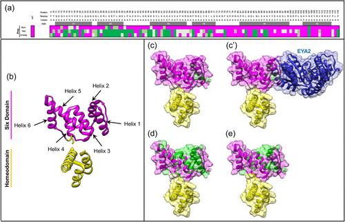 Figure 6 Alanine scanning mutagenesis reveals potential cofactor binding sites. (a) Alanine-scanning mutagenesis (X > A, A > F) of the Six1 SD was performed and SD + HD fragments were analyzed for their ability to interact with co-factors in Y2H assays; methods and scoring are as in Figure 5. The approximate positions of the six SD helices are indicated in gray. (b) Structural model of the Six1 SD (magenta) and HD (yellow) domains derived from a co-crystal structure with Eya2 (PDB: 4egc). (c–e) Y2H results from (a) were superimposed on the structure (b) to highlight regions (green) where aa substitutions disrupt co-factor interaction. (c) Eya1; (d) Tle4; (e) D-Sobp. (c′) Docking of Eya2 along the green surface of Six1. 3D renderings were generated using Chimera (v1.15; UCSF Resource for Biocomputing, Visualization, and Informatics). 3D, three dimensional; HD, homeodomain; PDB, Protein Data Bank; SD, Six domain. |