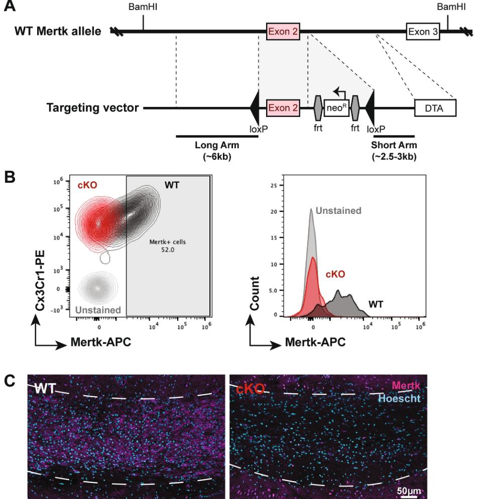 Fig. 1. Mertk is efficiently deleted from microglia in the presence of the Cx3Cr1 cre driver A Floxed Mertk mice were generated by the introduction of loxP sites on either side of exon 2 of the Mertk gene. An frt-flanked pGK-neomycin (neoR) cassette was also introduced for positive selection of embryonic stem cells. A diphtheria toxin A (DTA) cassette was introduced to allow for negative selection. B Representative flow cytometry plot (left) and corresponding histogram (right), indicating Mertk expression in Cx3Cr1+ve microglia generated from Mertk WT mice (black) compared with Cx3Cr1+ve microglia derived from Mertk cKO (red). C Widespread Mertk immunopositivity (magenta) is observed in the corpus callosum (dashed lines) of Mertk WT mice following 5 weeks of cuprizone-challenge to induce Mertk expression. Conversely, little to no Mertk expression is observed in the corpus callosum of Mertk cKO mice. Hoechst-labelled nuclei in blue. Scale bar represents 50 µm |