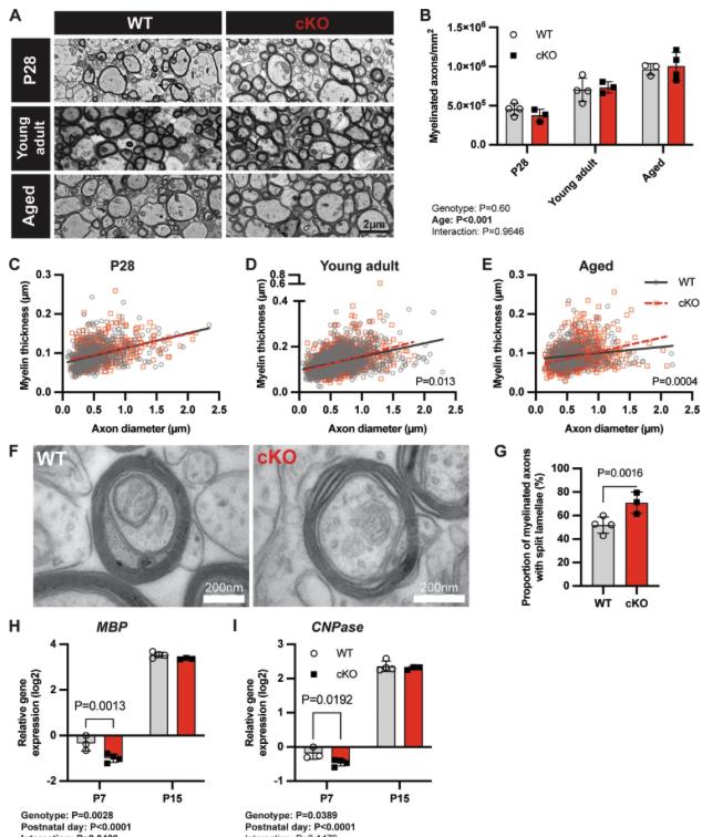 Fig. 2. Loss of microglial Mertk is associated with pathological myelin and reduced myelin gene expression. A Representative TEM images of myelinated axons in the corpus callosum of Mertk WT and cKO from P28, young adult (8–12 weeks) and aged (12 months) mice. B The density of myelinated axons was similar between WT and Mertk cKO mice at all time-points (two-way ANOVA; P > 0.05). Plots of myelin thickness versus axon calibre for P28 (C), adult (D) and aged (E) mice. A moderate shift towards thicker myelin was observed in adult (linear regression; P = 0.013) and aged (linear regression; P = 0.0004) mice was observed. F Representative high power TEM images of a myelinated axon in Mertk WT and cKO mice, demonstrating split lamellae in the latter. G Numbers of myelinated axons with at least one split lamellae are significantly increased in Mertk cKO mice (Fisher's exact test; P = 0.0016). The expression of the genes encoding MBP (H) and CNPase (I) is significantly reduced at P7 in the corpus callosum of Mertk cKO mice compared with WT, although this normalises by P15 (Student's t-test). Data represent mean ± SD with n = 3–5 biological replicates per genotype. For myelin thickness, all myelinated axons in a minimum of 6 non-overlapping images were measured. Data represent mean ± SD |