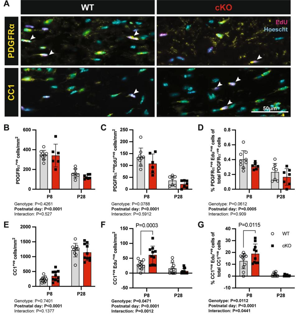 Fig. 4. Altered mature oligodendrocyte production in the absence of microglial Mertk during development. A Representative immunofluorescence images of P28 Mertk WT (left) and cKO (right) corpus callosum tissue stained for the OPC marker PDGFRα and mature oligodendrocyte marker CC1 (yellow), EdU (magenta) in addition to nuclear Hoechst stain (cyan). Arrowhead indicates EdU+/CC1+ cell. Scale bar corresponds to 50 µm. B The density of PDGFRα+ve OPCs was similar between genotypes. C A trend towards a reduction in the density of proliferating (Edu+ve) PDGFRa+ve OPCs was observed as well as a trend towards a reduction in the proportion of proliferating OPCs (D). E The density of CC1+ve cells/mm2 was not different between genotypes; however, the density of newly generated mature oligodendrocytes (CC1+ve Edu+ve) was increase twofold at P8 (F). G Similarly, the proportion of newly generated CC1+ve mature oligodendrocytes was increased at P8. Data represent mean ± SD. Statistical significance determined using 2-way ANOVA with Fisher’s LSD |