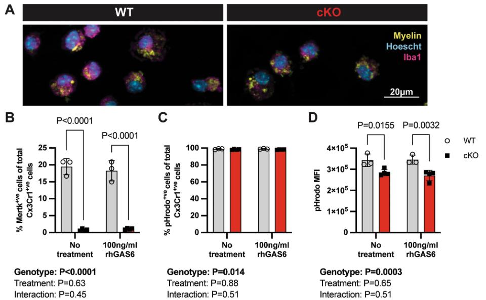 Fig. 7. Myelin phagocytosis is impaired in Mertk cKO cells in vitro. A Representative immunofluorescence images of fluorescently labelled myelin (yellow) engulfed by Iba1+ve microglia (magenta), generated from Mertk WT and cKO tissue. Hoechst-labelled nuclei in cyan. Scale bar represents 20 µm. B Cx3Cr1 + ve cKO microglia show almost complete deletion of Mertk (P < 0.0001). Expression of Mertk was not altered by treatment with rhGAS6 (P > 0.05). C Following delivery of pHrodo+ve myelin to the cultures, the vast majority of Cx3Cr1+ve cells were also pHrodo+ve, although a very small (< 1%) reduction in the percentage of pHrodo+ve cells was observed in Mertk cKO cultures (P = 0.014). No effect of rhGAS6 treatment on the proportion of pHrodo+ve cells was observed (P > 0.05). D. Cx3Cr1+ve Mertk cKO microglia engulfed significantly less myelin as determined using pHrodo median fluorescence intensity (MFI) (P = 0.0003), irrespective of rhGAS6 treatment (two-way ANOVA P > 0.05), indicating impaired myelin phagocytosis in Mertk-deficient microglia. n = 3–4 biological replicates. Data represent means ± SD. Statistical significance determined using two-way ANOVA with Fisher’s LSD |