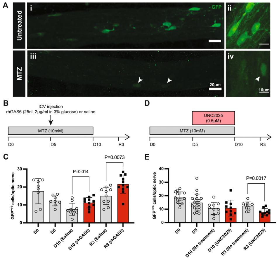 Fig. 9. Remyelination in the Tg(mbp:GFP-NTR) Xenopus laevis tadpole model of demyelination is influenced by Mertk signalling. A Representative fluorescent images of GFP+ve oligodendrocytes in the optic nerve of an untreated stage 50-55 Tg(mbp:GFP-NTR) Xenopus laevis tadpole at lower (i, iii) and higher (ii, iv) magnification. Following 10 days MTZ treatment, GFP+ve cells are almost completely ablated. Arrowheads indicate MTZ-resistant oligodendrocytes. Left and right scale bars represent 20 m and 10 m, respectively. B Demyelination (D) was induced in stage 50-55 Tg(mbp:GFP-NTR) Xenopus laevis tadpoles by MTZ treatment in aquaria water between D0 and D10. Tadpoles were then returned to normal water to remyelinate (R) for 3 days. The number of GFP+ve oligodendrocytes per optic nerve were counted on D0, D5, D10/11 and R3. To stimulate TAM signalling, tadpoles received an ICV injection of rhGAS6 (25nL volume, 2 g/ml in 3% glucose) or vehicle on D5. C rhGAS6 treatment increased GFP+ve cell numbers at D10 (P=0.014) and R3 (P=0.0073). D. To inhibit Mertk-signalling, tadpoles were treated with UNC2025 (0.5 M) between D5 and D10 or given no treatment. E UNC2025 treatment significantly reduced the numbers of GFP+ cells in the optic nerves at R3. (P=0.0017). n=820 biological replicates, from 2 repeated experiments. Data represent means/SD. Statistical significance was determined using unpaired t-tests |