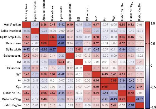 Figure S1. Relationship between biophysical properties of Xenopus tectal neurons at developmental stage 49. Pearson correlation matrix showing the relationship between cell properties for 61 stage 49 tectal neurons. Properties analyzed included neuronal intrinsic excitability (Max # spikes), characteristics of the first spike (spike threshold, spike amplitude, the rate of rise [20–80%], and spike width at 50%), and peak amplitudes for the voltage-gated fast Na+ current (Na+), transient potassium current (KT), and steady state potassium current (KSS). For 40 cells, we measured spike accommodation (Spike accom. = amplitude spike 1/amplitude spike 2), interspike interval (interstimulus intervals [ISI] = time peak of spike 1 − time peak of spike 2). For 22 cells, we measured interspike interval accommodation (ISI accom. = ISI spike 2–3/ISI spike 1–2). Values are Pearson correlation values (r). Bolded values indicate significant Pearson correlations (Bonferroni-corrected P-value < 0.05). |