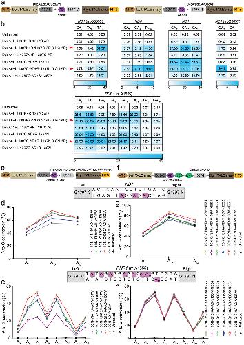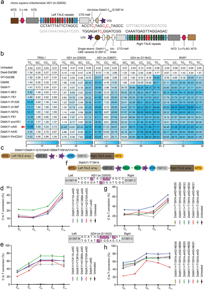 Figure 1 Engineered DdCBE variants show enhanced editing at TC, non-TC target sequences in mtDNA. a) Schematic of engineered DdCBE variants targeting ND1 (m.G3635) gene in the mitochondrial genome. b) Heat map showing C·G-to-T·A editing efficiencies induced by DddA (WT-DdCBE), DddA6, DddA11, and DddA11-fused cytosine deaminases with ssDNA activity in HEK293T cells at five mitochondrial target sites, including TRNL1, ND1, ND4, and RNR1. The cytosines in the top strands or bottom strands are presented as C-to-T conversion frequencies. The nucleotide adjacent to the end of the left-TALE-recognition sequence was numbered “‘1,”’ and C was sequentially numbered. For the heatmap, the number is given in units of %. Top 10% of EGFP- and mCherry-double positive cells were harvested from FACS 48 h after transfection. The targeting efficiency was tested by targeted deep sequencing. c) Architectures of DddA11-xAID with the reported high-fidelity mutations. d,e) Analysis of C·G-to-T·A editing frequencies at ND1 (m.G3635) and ND4 (m.G11642) sites induced by DddA11-xAID with high-fidelity mutations, including Q1310A, K1389A, T1391A, and V1411A. f) Architectures of DddA11-T1391A-xAID fused different nuclear export signal (NES) sequences. g,h) Analysis of C·G-to-T·A editing frequencies at ND1 (m.G3635) and ND4 (m.G11642) sites induced by DddA11-T1391A-xAID fused NES sequences. Values and error bars in (b), (d,e), and (g,h) reflect the mean ± s.e.m. of n = 3 independent biological replicates. |