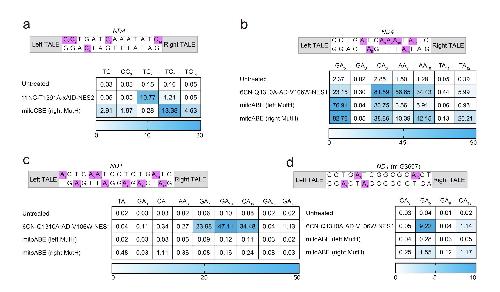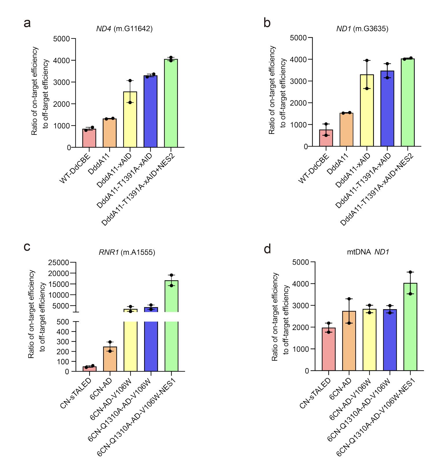 Figure S9. The ratio of on-target efficiency to off-target efficiency for each variant. a-b) The ratio of on-target efficiency to off-target efficiency for our engineered DdCBE variants at ND4 (m.G11642) and ND1 (m.G3635) sites. c-d) The ratio of on-target efficiency to off-target efficiency for our engineered TALED variants at RNR1 (m.A1555) and ND1 sites. All data points from n = 2 biologically independent experiments are shown. Data are presented as means ± SEM. |