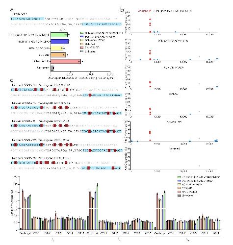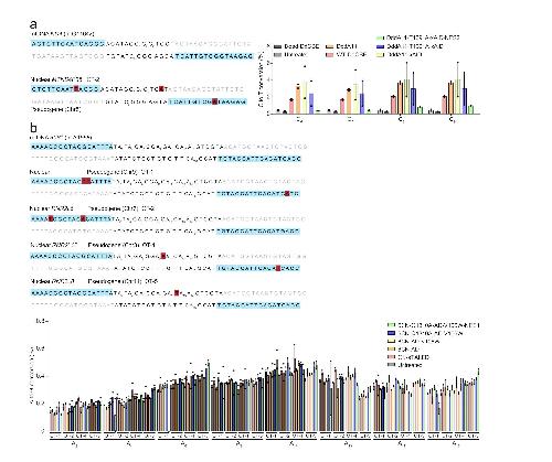 Figure S8. Off-target analysis for engineered DdCBEs and TALEDs specific to the ND4 (m.G11642) and RNR1 (m.A1555) sites on nuclear DNA in HEK293T cells. a) The other nuclear DNA sequence with the high homology is shown for the ND4 (m.G11642) site. TALE binding sites begin at N0 and are shown in blue. Nucleotide mismatches between the mtDNA and nuclear pseudogene are in red. Editing efficiencies are measured by targeted deep sequencing (see Table S4 for primer sequences) (Supporting Information). Data are presented as means ± SEM. b) The other nuclear DNA sequence with the high homology are shown for the RNR1 (m.A1555) site. TALE binding sites begin at N0 and are shown in blue. Nucleotide mismatches between the mtDNA and nuclear pseudogene are in red. Editing efficiencies are measured by targeted deep sequencing (see Table S4 for primer sequences) (Supporting Information). Data are presented as means ± SEM. |