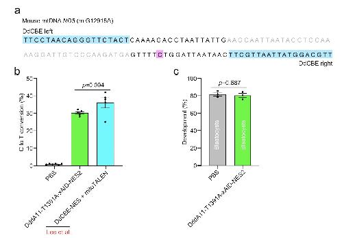 Figure S10. Engineered DdCBE variant mediates high editing efficiency in mouse blastocyst. a) Base editing target for generating the m.G12918A mutation. The TALE binding sequences for the DdCBE are highlighted in blue and for the base editing position in purple. b) The base editing efficiency of DddA11-T1391A-xAID-NES2 targeted ND5 (m.G12918) in mouse blastocysts. The data of the DdCBE-NES + mitoTALEN group were cited from Lee et al.. c) Developmental rate for PBS-injected embryos and injected embryos with DddA11-T1391A-xAID-NES2 targeting ND5 (m.G12918). Data are presented as the mean ± SEM. p values were evaluated with unpaired Student’s t-test. |