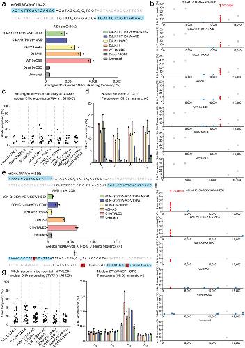 Figure 3. Off‐target analysis for engineered DdCBE and TALED variants targeting to the ND4 (m.G11642) and RNR1 (m.A1555) sites. a) The average frequencies of mitochondrial genome‐wide off‐target editing induced by Dead‐DdCBE, wild‐type DdCBE (WT‐DdCBE), DddA11, DddA11‐xAID, DddA11‐T1391A‐xAID, and DddA11‐T1391A‐xAID‐NES2 specific to the ND4 (m.G11642) site. Error bars are s.e.m. for n = 2 biologically independent samples. b) Mitochondrial genome‐wide plots for C‐to‐T point mutations with frequencies ≥1%. Naturally occurring SNVs, on‐target edits (including bystander edits in the editing window) and off‐target edits are shown in gray, red, and blue, respectively. All data points from n = 2 biologically independent experiments are shown. c) Genome‐wide off‐target analysis for engineered DdCBE variants targeting the ND4 (m.G11642) site. The C·G‐to‐T·A editing frequencies of each unique SNV are shown for the Dead‐DdCBE, WT‐DdCBE, and our engineered DdCBE variants. d) The corresponding nuclear DNA sequence with the greatest homology (mismatch = 0) is shown for the ND4 (m.G11642) site. Editing efficiencies are measured by targeted deep sequencing (see Table S4 for primer sequences) (Supporting Information). Data are presented as means ± SEM. e) The average frequencies of mitochondrial genome‐wide off‐target editing induced by CN‐sTALED, 6CN‐AD, 6CN‐AD‐V106W, 6CN‐Q1310A‐AD‐V106W, and 6CN‐Q1310A‐AD‐V106W‐NES1 specific to the RNR1 (m.A1555) site. Error bars are s.e.m. for n = 2 biologically independent samples. f) Mitochondrial genome‐wide plots for A‐to‐G point mutations with frequencies ≥1%. Naturally occurring SNVs, on‐target edits (including bystander edits in the editing window) and off‐target edits are shown in gray, red, and blue, respectively. All data points from n = 2 biologically independent experiments are shown. g) Genome‐wide off‐target analysis for engineered TALED variants targeting the RNR1 (m.A1555) site. The A·T‐to‐G·C editing frequencies of each unique SNV are shown for CN‐sTALED and our engineered TALED variants. h) The corresponding nuclear DNA sequence with the high homology (mismatch = 3) is shown for the RNR1 (m.A1555) site. TALE binding sites begin at N0 and are shown in blue. Nucleotide mismatches between the mtDNA and nuclear pseudogene are in red. Editing efficiencies are measured by targeted deep sequencing (see Table S4 for primer sequences) (Supporting Information). Data are presented as means ± SEM. |