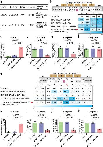 Figure 4 Application of high-fidelity DdCBE and TALED variants to install pathogenic mutations in HEK293T cells. a) Using high-fidelity DdCBE and TALED variants to install disease-associated target mutations in human mtDNA (S, serine; N, asparagine). b) Mitochondrial C-to-T editing efficiencies of HEK293T cells treated with DddA11-T1391A-xAID-NES2 variant at G1397 and G1333 orientation of split DddAtox for the mitochondrial ND1 (m.G3635) site in previously inaccessible GC targets. On-target cytosines are colored red or gray, respectively. Top 30% of EGFP- and mCherry-double positive cells expressing the DdCBE variants were isolated by FACS for targeted deep sequencing. The split orientation, target spacing region, and corresponding encoded amino acids are shown. 11NC-T1391A-xAID-NES2, Right–G1397-C + Left–G1397-N orientation; 11CN-T1391A-xAID-NES2, Right–G1397-N + Left–G1397-C orientation; 1333-11NC-T1391A-xAID-NES2, Right–G1333-C + Left–G1333-N orientation; 1333-11CN-T1391A-xAID-NES2 (DddA12-xAID-NES2), Right–G1333-N + Left–G1333-C orientation. Shown are means ± SEM; n = 3 independent experiments. The transfection time was 2 days. For the heatmap, the number is given in units of %. c–f) The levels of intracellular ROS (c), ATP (d) and the activities of complex I (e), complex IV (f) in sorted HEK293T cells treated with the DddA12-xAID-NES2 or Dead-DdCBE for the ND1 (m.G3635) site. mOD, absorbance at optical density of 450 nm (complex I activity) or 550 nm (complex IV activity). Data are presented as means ± SEM. p values were evaluated with the unpaired student's t-test (two-tailed). All data points from n = 3 biologically independent experiments are shown. g) Mitochondrial A-to-G editing efficiencies of HEK293T cells treated with 6CN-Q1310A-AD-V106W-NES1 variant at G1397 and G1333 orientation of split DddAtox for the mitochondrial TG (m.T10010) site. On-target adenines are colored red or gray, respectively. Top 30% of EGFP- and mCherry-double positive cells expressing the TALED variants were isolated by FACS for targeted deep sequencing. The split orientation, target spacing region and corresponding encoded amino acids are shown. 6CN-Q1310A-AD-V106W-NES1, Right–G1397-N + Left–G1397-C orientation; 6NC-Q1310A-AD-V106W-NES1, Right–G1397-C + Left–G1397-N orientation; 1333–6CN-Q1310A-AD-V106W-NES1, Right–G1333-N + Left–G1333-C orientation; 1333–6NC-Q1310A-AD-V106W-NES1 (DddA13-V106W-NES1), Right–G1333-C + Left–G1333-N orientation. Shown are means ± SEM; n = 3 independent experiments. The transfection time was 2 days. For the heatmap, the number is given in units of %. h–k) The levels of intracellular ROS (h), ATP (i) and the activities of complex I (j), complex IV (k) in sorted HEK293T cells treated with the DddA13-V106W-NES1 or Dead-DdCBE for the TG (m.T10010) site. Data are presented as means ± SEM. p values were evaluated with the unpaired student's t-test (two-tailed). All data points from n = 3 biologically independent experiments are shown. |
