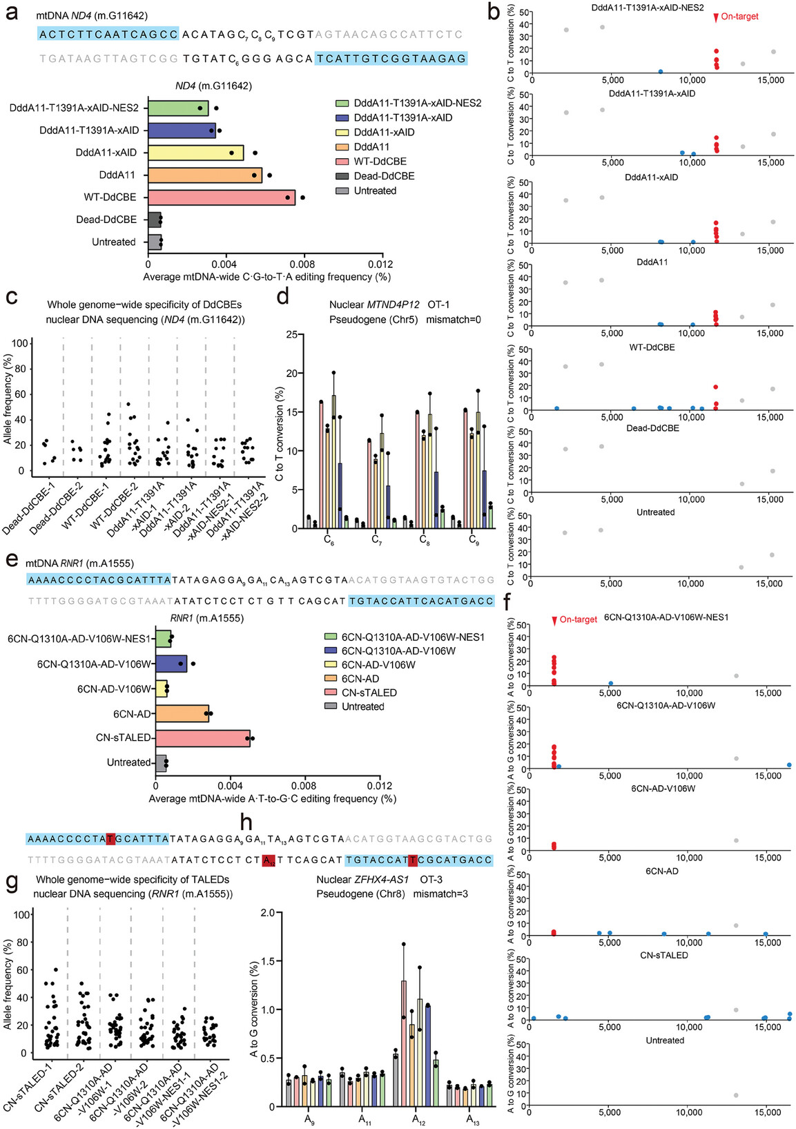 Figure 3 Off-target analysis for engineered DdCBE and TALED variants targeting to the ND4 (m.G11642) and RNR1 (m.A1555) sites. a) The average frequencies of mitochondrial genome-wide off-target editing induced by Dead-DdCBE, wild-type DdCBE (WT-DdCBE), DddA11, DddA11-xAID, DddA11-T1391A-xAID, and DddA11-T1391A-xAID-NES2 specific to the ND4 (m.G11642) site. Error bars are s.e.m. for n = 2 biologically independent samples. b) Mitochondrial genome-wide plots for C-to-T point mutations with frequencies ≥1%. Naturally occurring SNVs, on-target edits (including bystander edits in the editing window) and off-target edits are shown in gray, red, and blue, respectively. All data points from n = 2 biologically independent experiments are shown. c) Genome-wide off-target analysis for engineered DdCBE variants targeting the ND4 (m.G11642) site. The C·G-to-T·A editing frequencies of each unique SNV are shown for the Dead-DdCBE, WT-DdCBE, and our engineered DdCBE variants. d) The corresponding nuclear DNA sequence with the greatest homology (mismatch = 0) is shown for the ND4 (m.G11642) site. Editing efficiencies are measured by targeted deep sequencing (see Table S4 for primer sequences) (Supporting Information). Data are presented as means ± SEM. e) The average frequencies of mitochondrial genome-wide off-target editing induced by CN-sTALED, 6CN-AD, 6CN-AD-V106W, 6CN-Q1310A-AD-V106W, and 6CN-Q1310A-AD-V106W-NES1 specific to the RNR1 (m.A1555) site. Error bars are s.e.m. for n = 2 biologically independent samples. f) Mitochondrial genome-wide plots for A-to-G point mutations with frequencies ≥1%. Naturally occurring SNVs, on-target edits (including bystander edits in the editing window) and off-target edits are shown in gray, red, and blue, respectively. All data points from n = 2 biologically independent experiments are shown. g) Genome-wide off-target analysis for engineered TALED variants targeting the RNR1 (m.A1555) site. The A·T-to-G·C editing frequencies of each unique SNV are shown for CN-sTALED and our engineered TALED variants. h) The corresponding nuclear DNA sequence with the high homology (mismatch = 3) is shown for the RNR1 (m.A1555) site. TALE binding sites begin at N0 and are shown in blue. Nucleotide mismatches between the mtDNA and nuclear pseudogene are in red. Editing efficiencies are measured by targeted deep sequencing (see Table S4 for primer sequences) (Supporting Information). Data are presented as means ± SEM. |