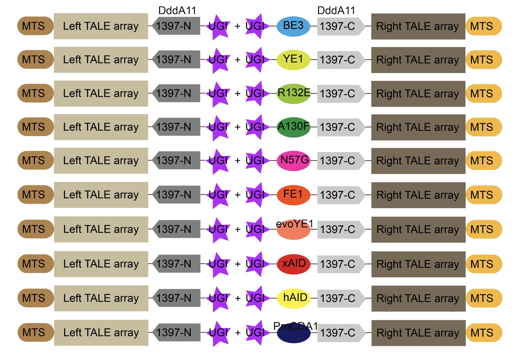 Figure S1. Schematic showing the architectures of DddA11 fused ten cytosine deaminases with ssDNA activity used in this study. MTS, mitochondrial targeting sequence; UGI, uracil glycosylase inhibitor; BE3 = rat APOBEC1; YE1 = BE3W90Y+R126E; R132E = BE3R132E; A130F = human APOBE3AA130F; N57G = human APOBE3AN57G; FE1 = BE3W90F+R126E; evoYE1 = engineered BE3W90Y+R126E; xAID = Xenopus laevis activation-induced cytidine deaminase (AID); hAID = human activation-induced cytidine deaminase (AID); PmCDA1 = petromyzon marinus cytidine deaminase 1. |