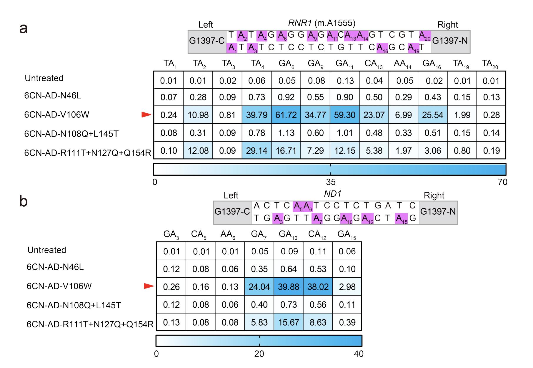 Figure S3. Target A-to-G conversions using engineered TALED variant (6CN-AD) and recently reported several mutations of TadA8e in the mitochondrial RNR1 (m.A1555) and ND1 genes. a-b) Heat map showing A·T-to-G·C editing efficiencies induced by 6CN-AD with N46L, V106W, N108Q + L145T, and R111T + N127Q + Q154R mutations in HEK293T cells at two mitochondrial target sites, including RNR1 (m.A1555) (a) and ND1 (b). The adenines in the top strands or bottom strands are presented as A-to-G conversion frequencies. The nucleotide adjacent to the end of the left-TALE-recognition sequence was numbered ‘‘1,’’ and A was sequentially numbered. Top 10% of EGFP- and mCherry-double positive cells were harvested from fluorescence-activated cell sorting (FACS) 48 h after transfection. The targeting efficiency was tested by targeted deep sequencing. All values are presented as the average of n = 3 biologically independent experiments. The number is given in units of %. |