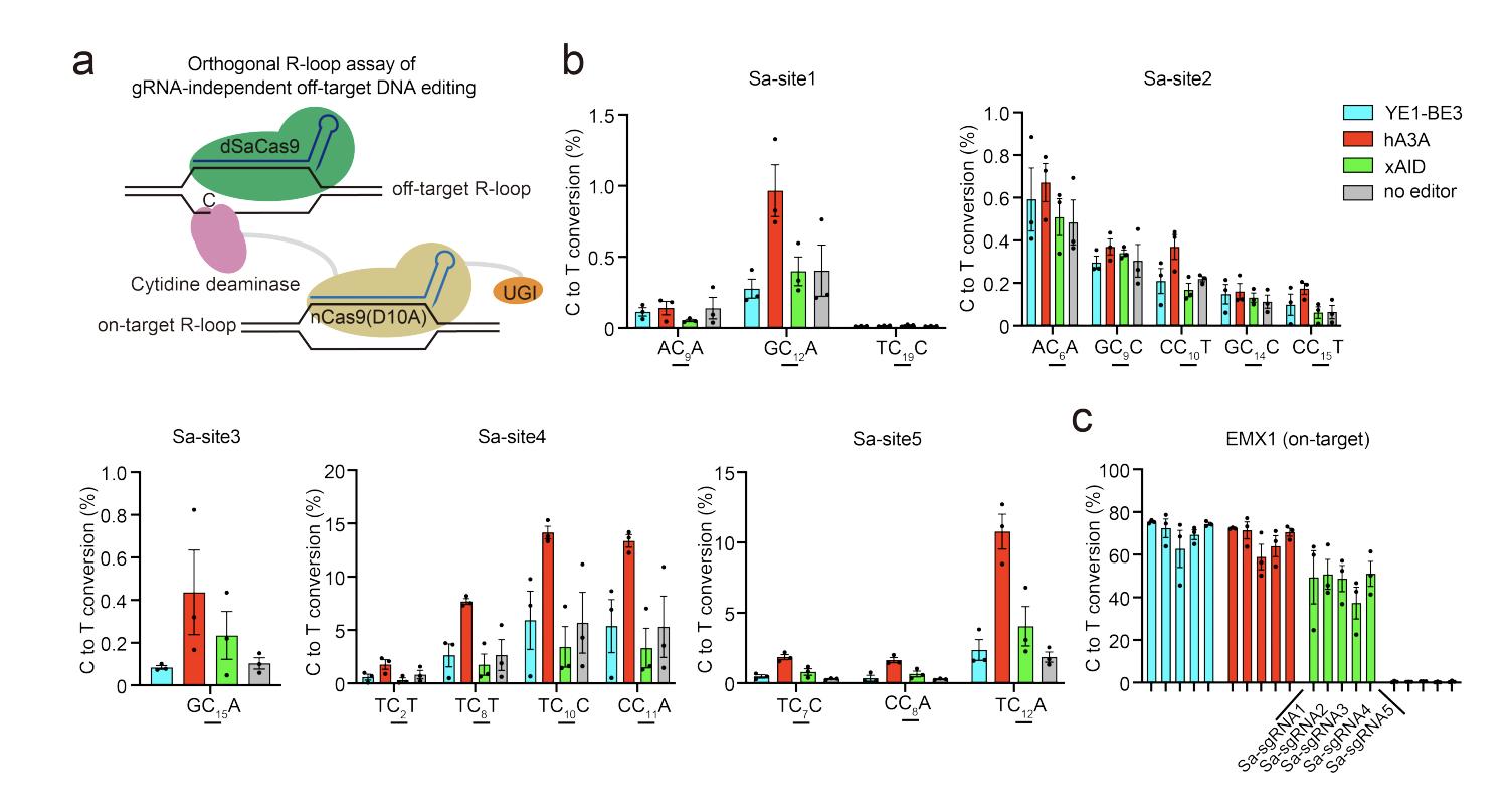 Figure S6. Sequence-independent off-target analysis for different cytosine deaminases in HEK293T cells via R-loop assay. a) Schematic of sequence-independent deamination of cytosines within dSaCas9-induced R-loop sites by deaminase fused with SpCas9. b) Sequence-independent off-target C•G-to-T•A editing frequencies detected by targeted high-throughput sequencing of five dSaCas9-induced R-loop loci following co-transfection with different CBEs made from fusion of SpCas9 with YE1-BE3, hA3A, and xAID. Editing efficiencies are measured by targeted deep sequencing (see Table S5 for protospacer and primer sequences) (Supporting Information). c) On-target DNA base editing efficiencies at the EMX1 genomic locus corresponding to the SpCas9 sgRNA. Editing efficiencies are measured by targeted deep sequencing (see Table S5 for protospacer and primer sequences) (Supporting Information). All data points from n = 3 biologically independent experiments are shown. Data are presented as means ± SEM. |
