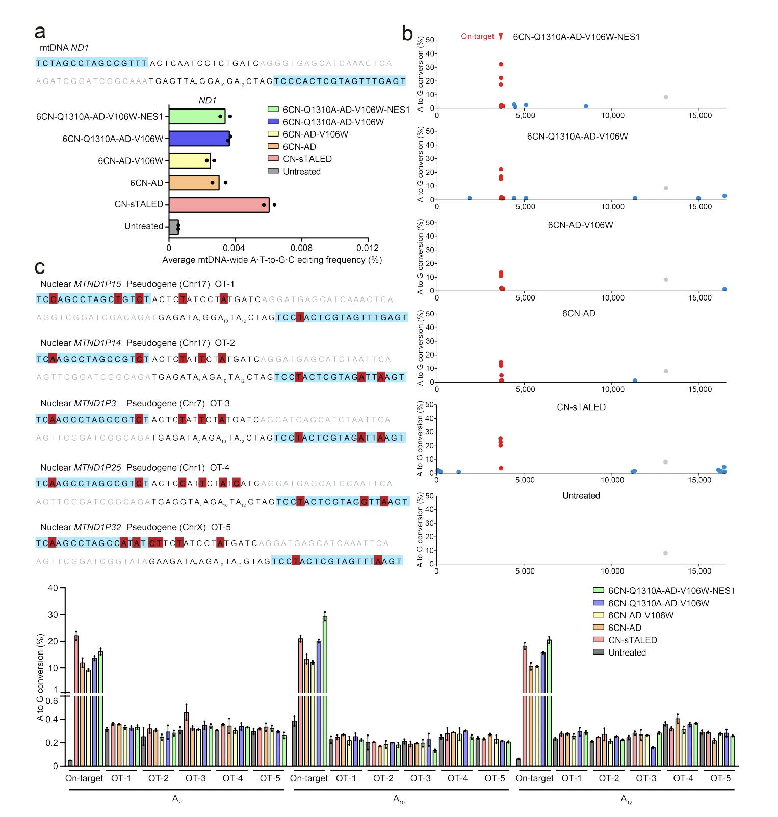 Figure S7. Off-target analysis for engineered TALEDs specific to the ND1 site. a) The average frequencies of mitochondrial genome-wide off-target editing induced by CN-sTALED, 6CN-AD, 6CN-AD-V106W, 6CN-Q1310A-AD-V106W, and 6CN-Q1310A-AD-V106W-NES1 specific to the ND1 site. Error bars are s.e.m. for n = 2 biologically independent samples. b) Mitochondrial genome-wide plots for A-to-G point mutations with frequencies ≥1%. Naturally occurring SNVs, on-target edits (including bystander edits in the editing window) and off-target edits are shown in blue and red, respectively. All data points from n = 2 biologically independent experiments are shown. c) The corresponding nuclear DNA sequences with the high homology are shown for the ND1 site. TALE binding sites begin at N0 and are shown in blue. Nucleotide mismatches between the mtDNA and nuclear pseudogene are in red. Editing efficiencies are measured by targeted deep sequencing (see Table S4 for primer sequences) (Supporting Information). Data are presented as means ± SEM. |