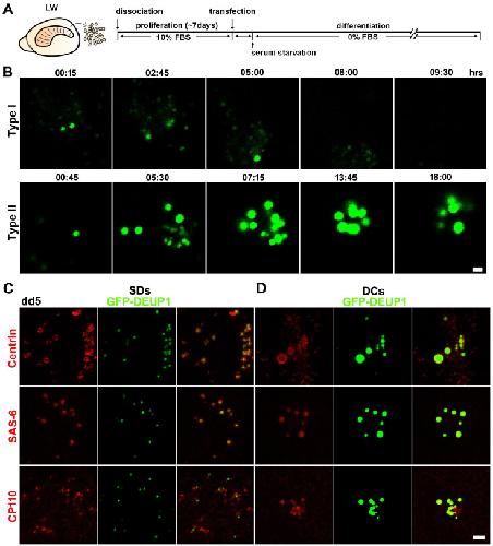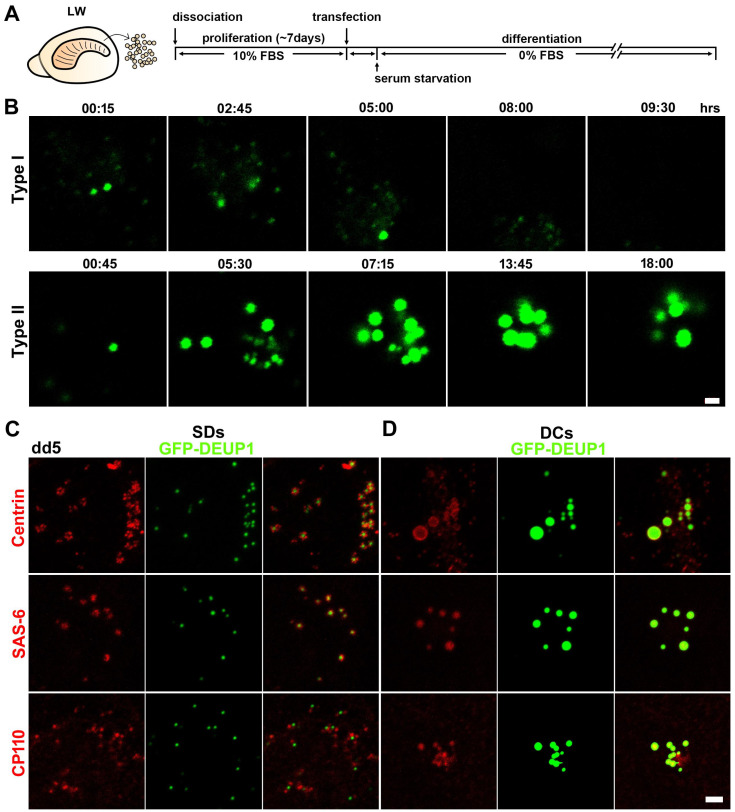 Fig. 1. Two different patterns of Deup1 protein form and aggregate in primary ependymal cells.(A) Schematic diagram illustrating the culture of primary ependymal cells using mouse brain LW at P1 or P2. LW, lateral wall; FBS, fetal bovine serum. (B) Live imaging analysis of cells expressing Deup1. The time-lapse confocal microscope was used to capture images every 15 min of cells with GFP-positive deuterosome-like structures. Scale bar = 1 µm. (C and D) Analysis of the colocalization of GFP-Deup1 puncta with other centriole markers, Centrin, SAS-6, and CP110. The Deup1 puncta are distributed as deuterosome-like structures (SDs) or clustered as much larger aggregates (DCs). The images were taken using a confocal microscope at differentiation day 5 (dd5). Scale bar = 2 µm. SDs, scattered deuterosomes; DCs, deuterosome clusters.