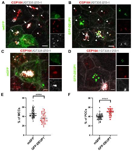 Fig. 2. Gain-of-function of Deup1 inhibits the differentiation of ependymal precursor cells into multiciliated cells in vitro.(A and B) Confocal microscopy analysis of ependymal cells at differentiation day (dd) 14. Transfected cells with mGFP or GFP-Deup1 were analyzed with GFP signals in green, BBs with CEP164 in red, cilia with GT335 in gray, and cell boundaries with ZO-1 in gray. The right panel shows each fluorescence at a low magnification. Scale bars = 10 µm. (C and D) Representative images of transfected cells showing BBs (red, CEP164) and cilia (gray, GT335). It is noteworthy that most of the Deup1 transfected cells had GFP-positive DCs at this stage of differentiation. Scale bars = 5 µm. (E and F) MCCs and PCCs were quantified in each field regardless of GFP signal. The data are presented as mean ± SD. For the mGFP control arm, n = 51 fields were collected from 12 plates; for the GFP-Deup1 group, n = 47 fields were collected from 11 plates. The data were compared using a two-tailed t-test. ****P < 0.0001. BBs, basal bodies; DCs, deuterosome clusters; MCCs, multiciliated cells; PCCs, primary ciliated cells.