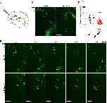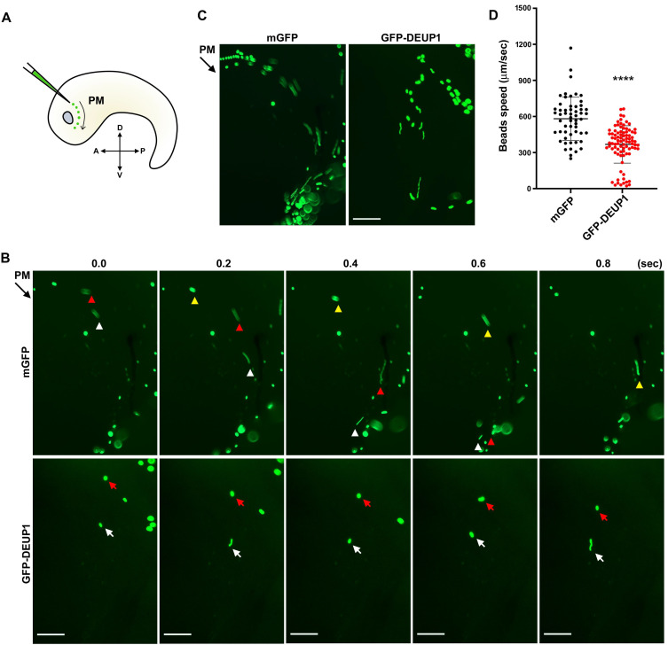 Fig. 5. Ectopic expression of Deup1 impairs the normal flow of cerebrospinal fluid in the ependymal tissue.(A) Diagram depicts the movement of fluorescent beads (green). In this illustration, the flow of beads is in the posterior-medial (PM) direction, right behind the adhesion area (shown in gray). A, anterior; P, posterior; D, dorsal; V, ventral. (B) A high-speed video imaging analysis of each fluorescent bead at different time points. In the mGFP group, each bead is represented by an arrowhead of a different color; similarly, in the GFP-DEUP1 group, each bead is marked with an arrow of a different color. (C) A single image was generated by merging 17 consecutive frames taken at 200 ms intervals. Scale bars = 100 µm (B and C). (D) The speed of each microbead was calculated. The data are presented as mean ± SD. ****P < 0.0001. For the mGFP group, n = 56 beads from 6 mice; for the GFP-DEUP1 group, n = 88 beads from 8 mice.
