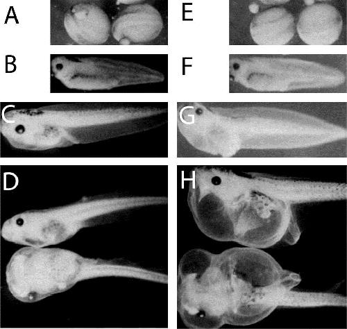 Effects of Xhoxc8 antisense RNA injection. Capped synthetic sense and antisense Xhoxc8 RNAs were produced from linealized pBXhoxcw8 plasmid. Total 1 ng of sense (A–D) or antisense Xhoxc8 (E–H) RNA was injected into each blastomere of 2- or 4-cell stage embryos. The RNA injected animals were analyzed at st. 12 (A,E), 35 (B,F), 41 (C,G), and 48 (D,H).