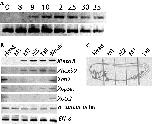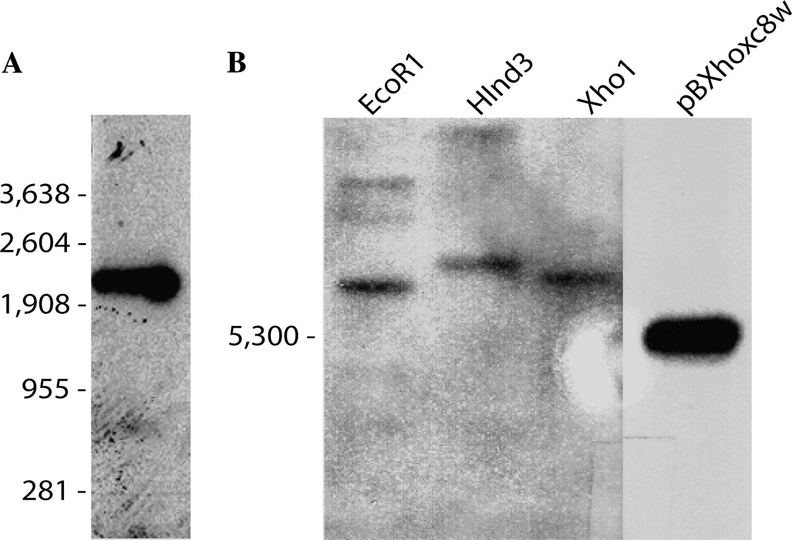 Northern (A) and Southern blot (B) analyses for the determination of Xhoxc8 mRNA size and Xhoxc8 gene-copy number. For Northern blot, 20 μg of stage 20 total RNA was loaded on to the 1.2% agarose gel, which was run and transferred to nylon membrane in 10× SSC. The blot was hybridized with DIG-labeled RNA probe prepared from linealized pBXhoxc8w DNA template. For Southern blot, 10 μg of restriction enzyme digests of genomic DNA was size-fractionated on 1% agarose gel in TAE buffer and transferred to nylon membrane. Blots were hybridized with the same probe used in Northern blot analysis.
