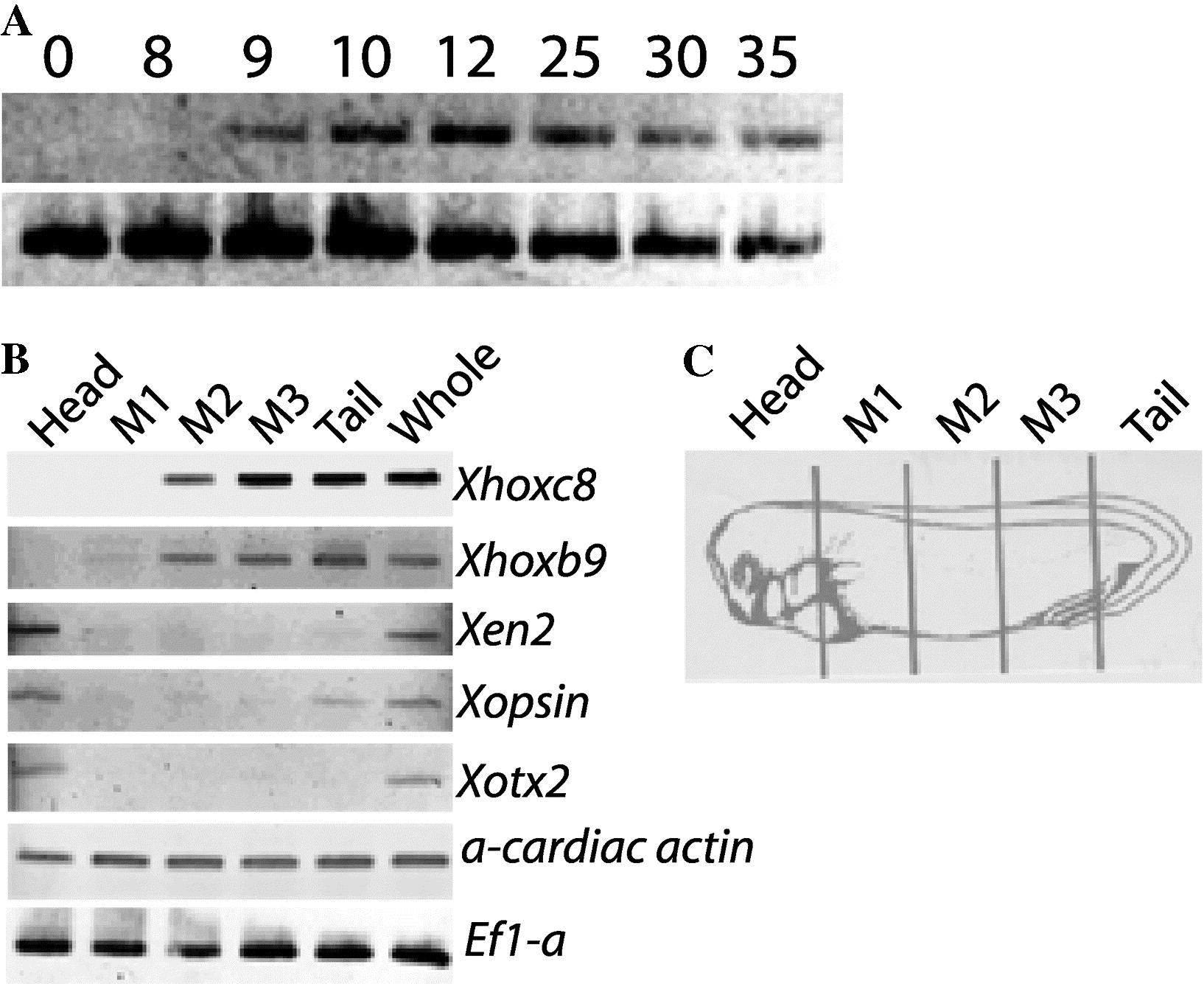 Expression pattern of Xhoxc8 analyzed by RT-PCR. (A) One μg of stage 0–35 total RNA was reverse transcribed and PCR amplified using Xhoxc8 specific primer. (B) Expression of Xhoxc8 along A-P at stage 30 and comparison of expressions with region-specific marker genes. Total RNAs for analyses were extracted from dissected parts of stage 30 embryos (Head, M1, M2, and M3) or from a whole embryo (Whole). Ef1-α and α-cardiac actin were used for internal control. (C) Vertical lines indicate the dissected regions.