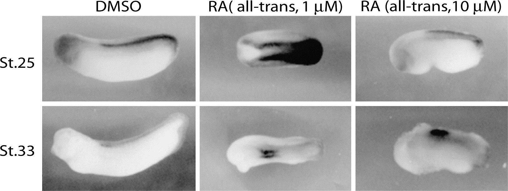 Effects of retinoic acid treatment on the Xhoxc8 expression. Embryos were treated with all-trans retinoic acid (RA, 1 or 10 μM) or dimethyl sulfoxide (DMSO). Stage 5 embryos were cultured in 0.1× MMR containing DMSO or RA until they reached stage 12. At stage 12, embryos were washed several times with 0.1× MMR and then cultured in the media until they reached stage 25 or 33. The embryos were fixed in MEMFA and the Xhoxc8 expression level was examined by whole-mount in situ hybridization.