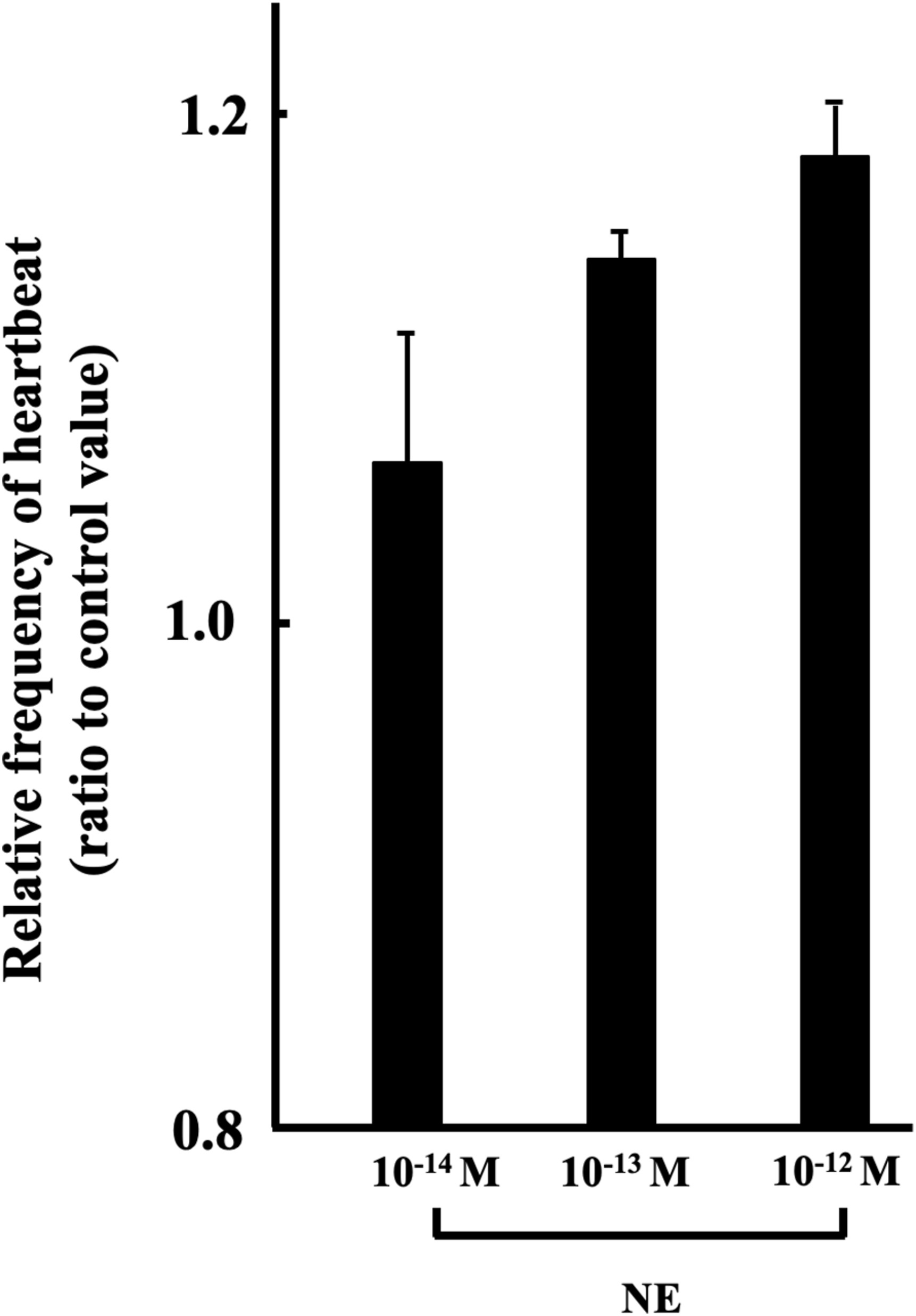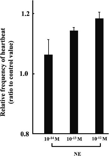 Fig. 5. Effect of NE on in vitro st. 57 hearts in 60% MEM. Each value was measured by number of heartbeats times per minute, and represented by ratio given to the control value. Experiment was carried out using 4 hearts. Values given represent the mean value ± standard error.