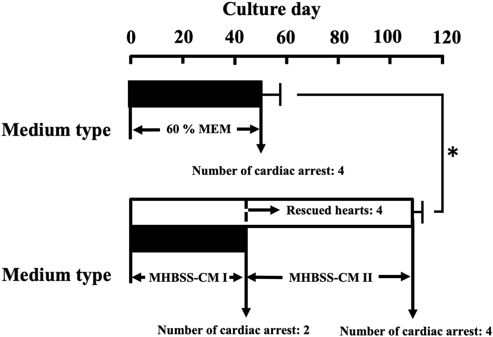 Fig. 1. Culture days of st. 57 X. laevis heart in 60% MEM and MHBSS-CM I and II. This experiment was carried out using 4 hearts in 60% MEM and 6 hearts in MHBSS-CM I-II. Values given represent the mean value ± standard error. *Significantly greater (P < 0.05) than the corresponding value for 60% MEM. Long-term culture of spontaneously beating tadpole-hearts. Each medium composition of MHBSS-CM I and II was mentioned in the section of ‘Materials and Methods’.