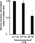 Fig. 3. ACh-decreased heartbeats frequency of organ-cultured st. 57 hearts. Each value was measured by number of heartbeats times per minute, and represented by ratio to the control value. Experiment was carried out using 4 hearts. Values given represent the mean value ± standard error.